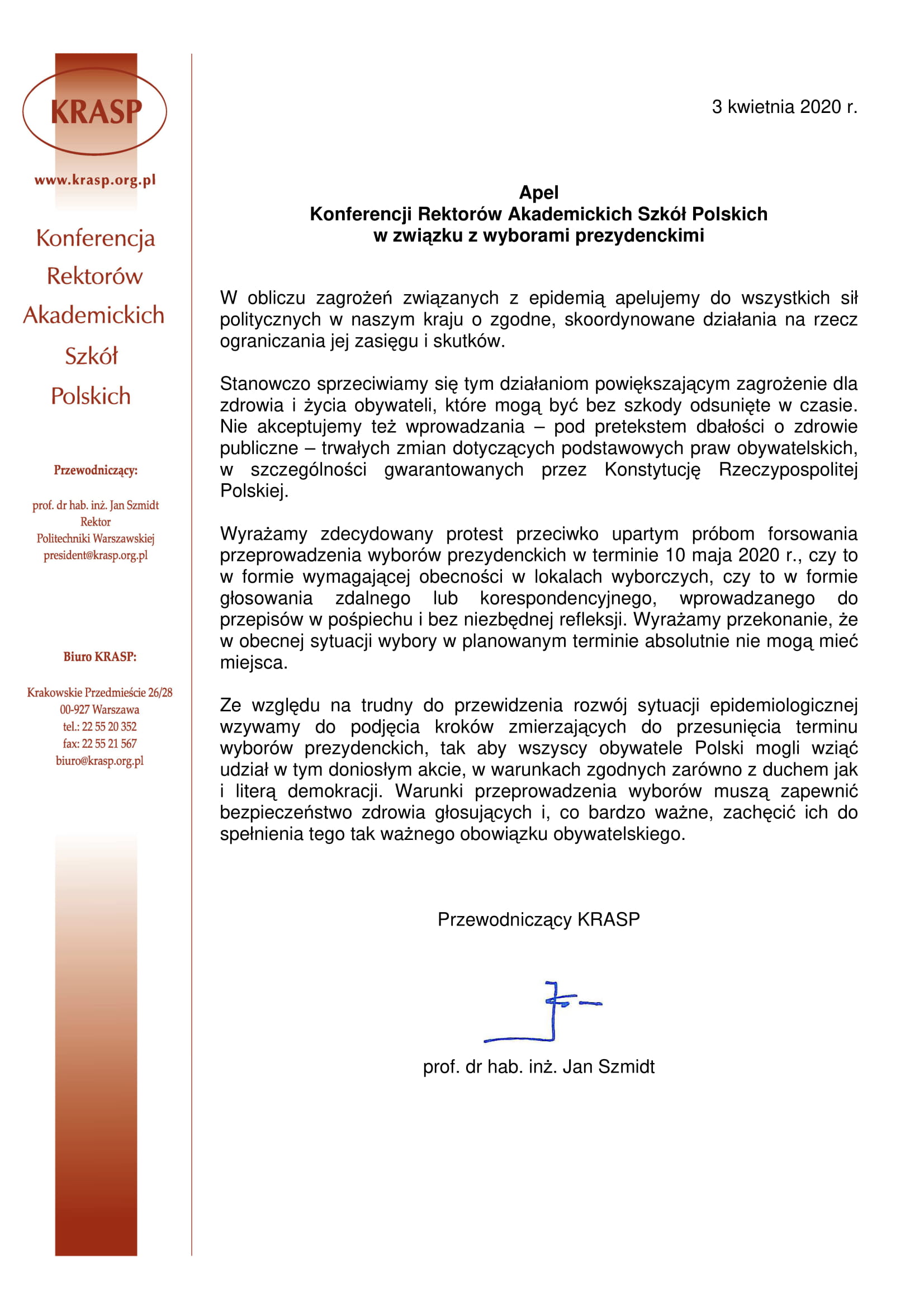 Apel Konferencji Rektorów Akademickich Szkół Polskich w sprawie wyborów prezydenckich