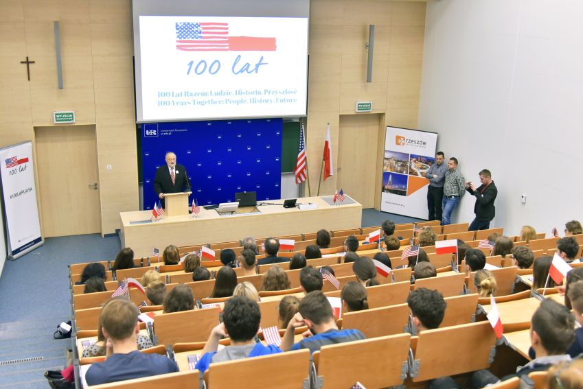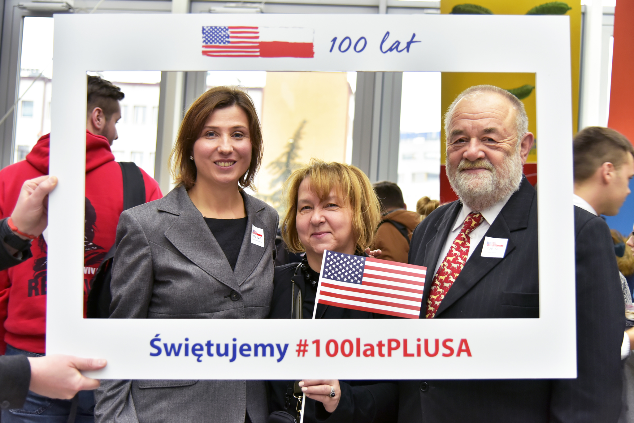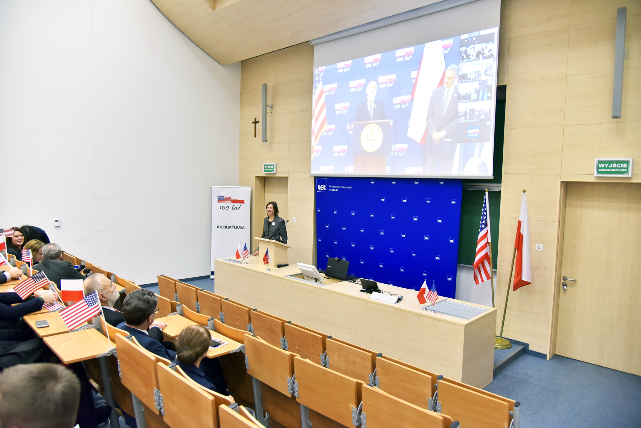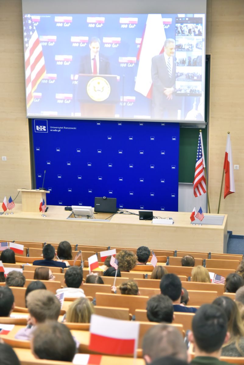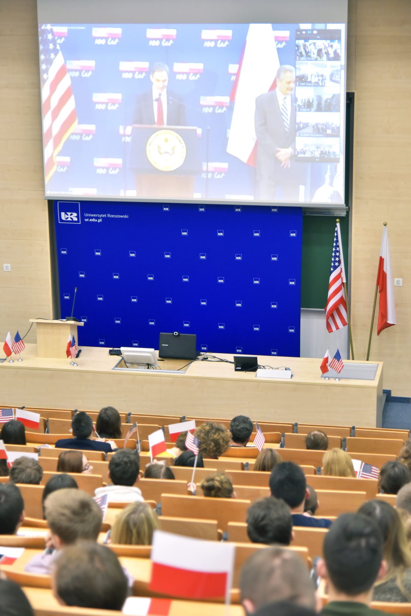 Jednym z elementów spotkania było połączenie z Ambasadorem USA Panem Paulem Jonesem, który przedstawił uczestników spotkania w poszczególnych lokalizacjach w całej Polsce oraz opowiedział o historii wzajemnych relacji na przestrzeni ostatnich 100 lat.