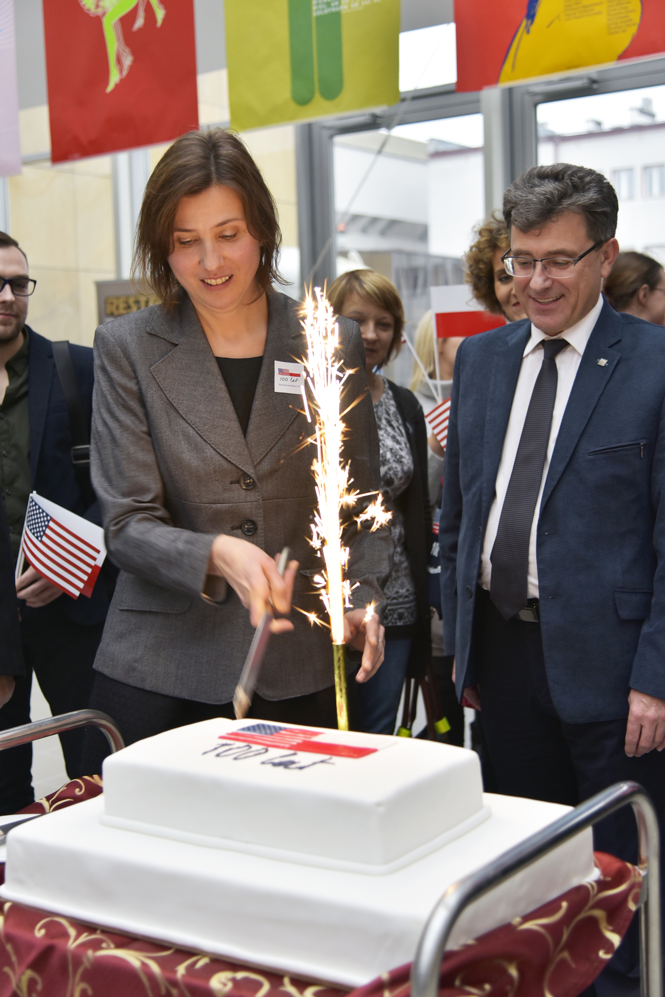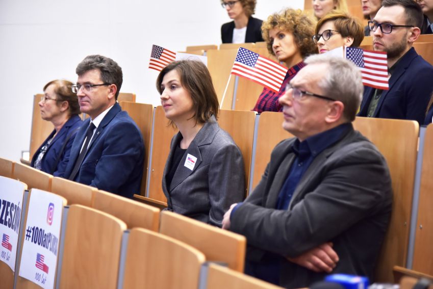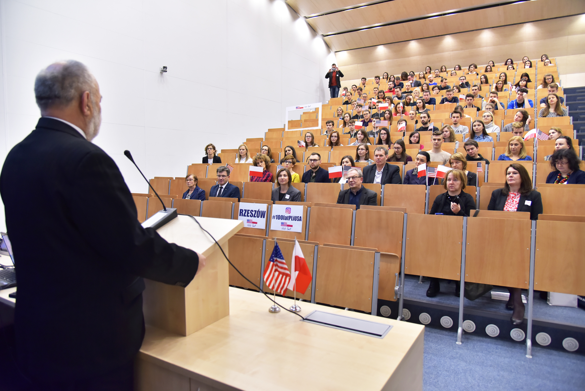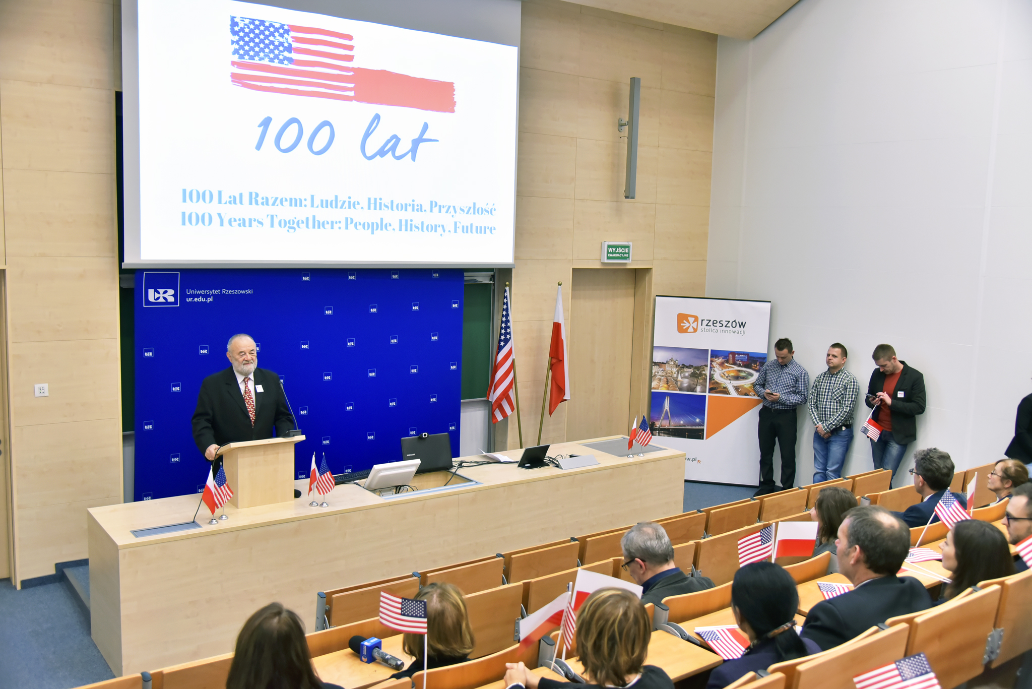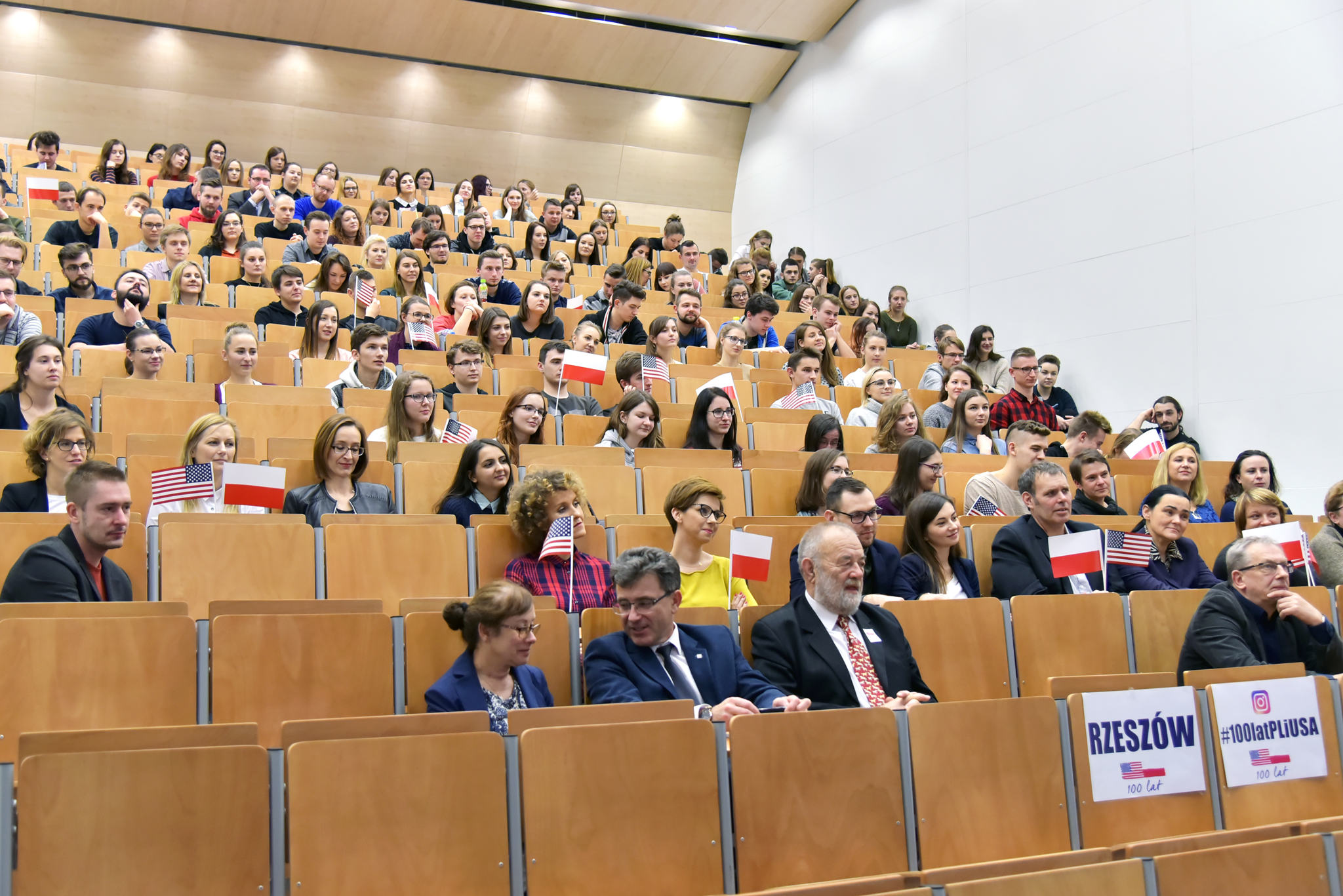 Jednym z elementów spotkania było połączenie z Ambasadorem USA Panem Paulem Jonesem, który przedstawił uczestników spotkania w poszczególnych lokalizacjach w całej Polsce oraz opowiedział o historii wzajemnych relacji na przestrzeni ostatnich 100 lat.