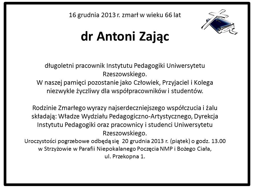 16 grudnia 2013 r. zmarł w wieku 66 lat dr Antoni Zając
