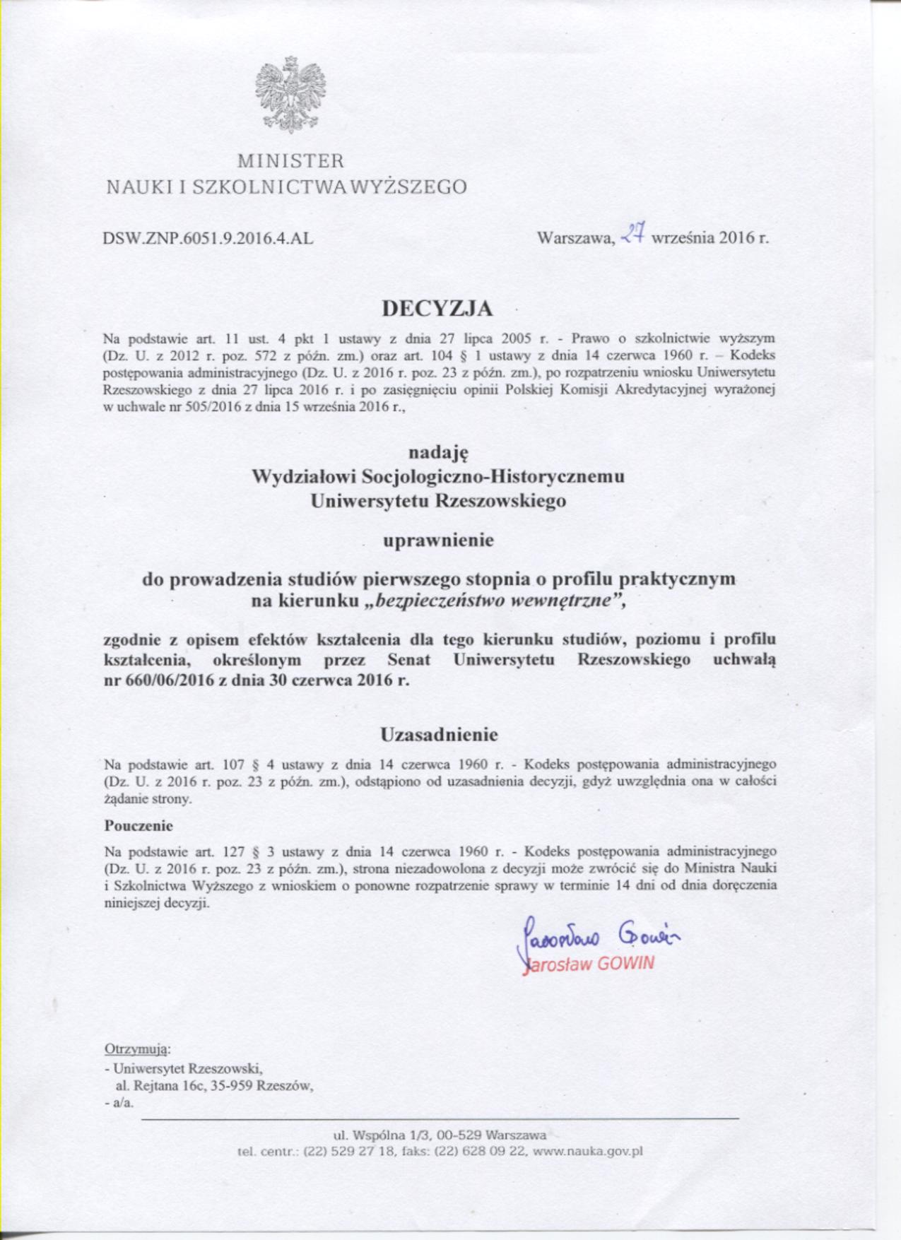Z przyjemnością informujemy, że decyzją p. ministra Jarosława Gowina Wydział Socjologiczno-Historyczny Uniwersytetu Rzeszowskiego otrzymał uprawnienia do prowadzenia studiów I stopnia na kierunku "bezpieczeństwo wewnętrzne". To już 10 kierunek studiów, który będzie prowadzony przez Wydział Socjologiczno-Historyczny.