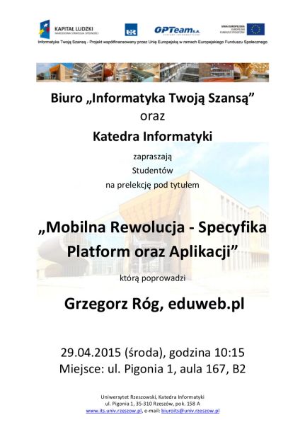 Biuro „Informatyka Twoją Szansą” oraz Katedra Informatyki zapraszają studentów na prelekcję pod tytułem „Mobilna Rewolucja - Specyfika Platform oraz Aplikacji”
