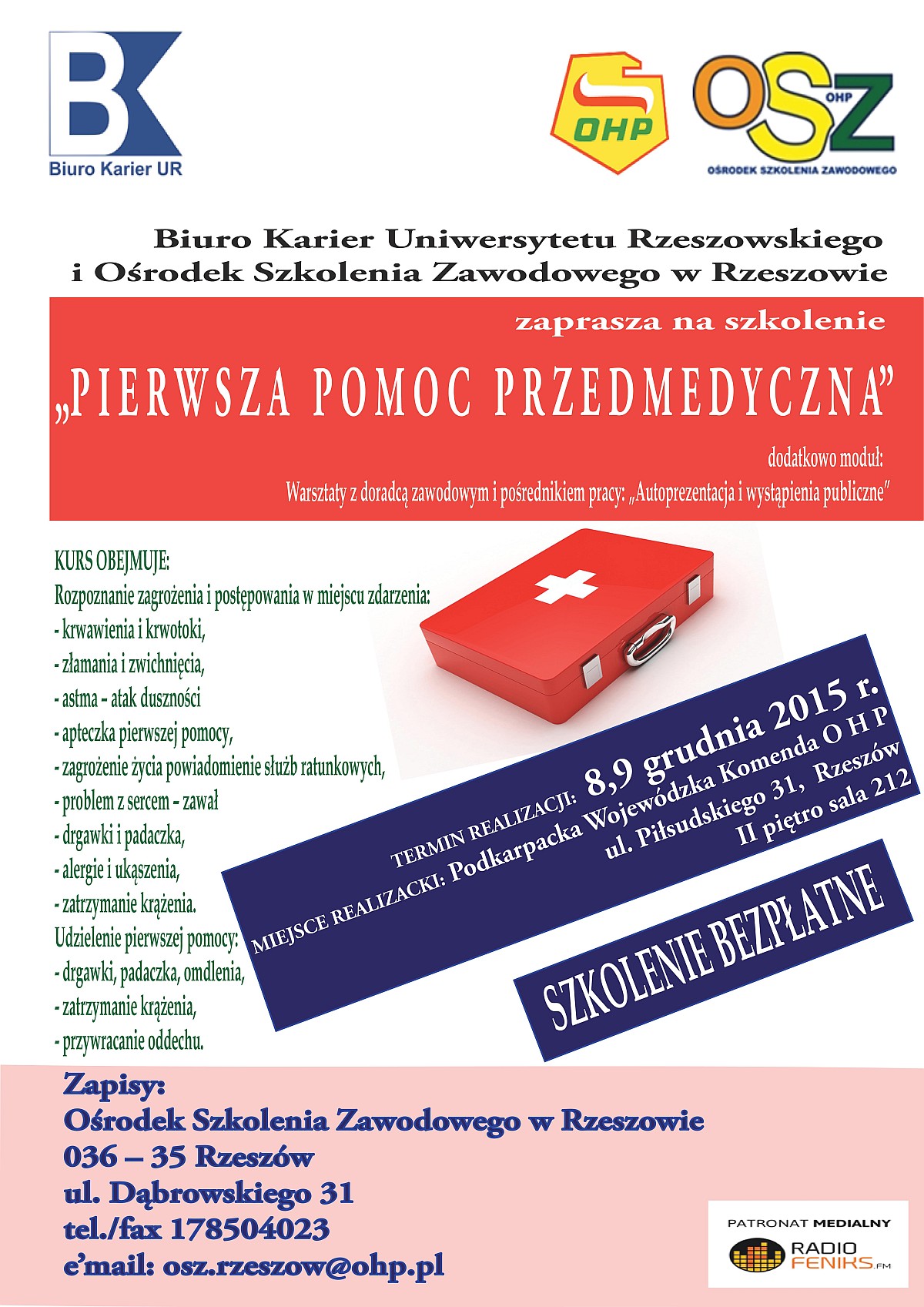 Biuro Karier Uniwersytetu Rzeszowskiego i Ośrodek Szkolenia Zawodowego w Rzeszowie zaprasza na szkolenie „P I E R W S Z A P O M O C P R Z E D M E D Y C Z N A”