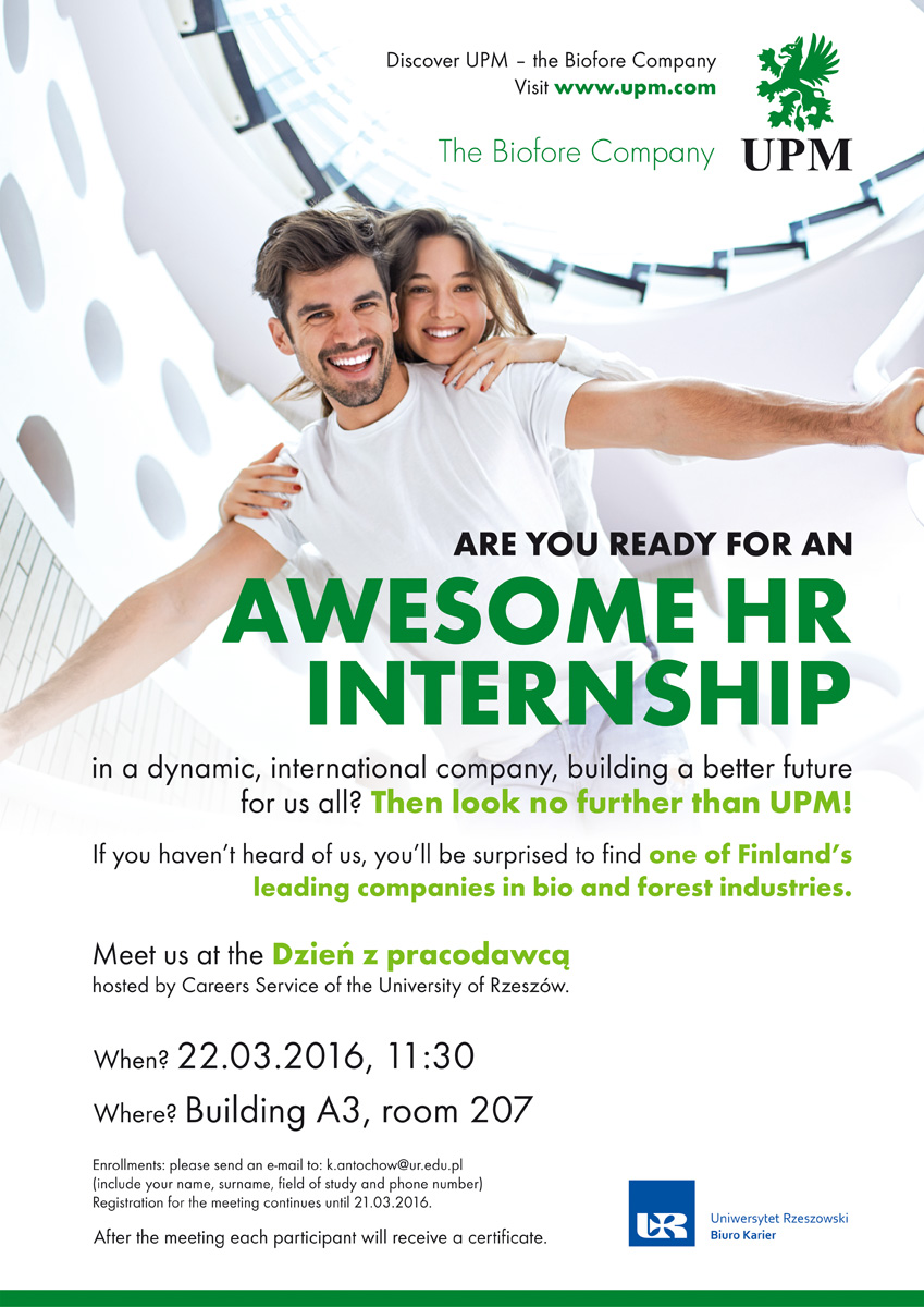 międzynarodowej firmy, która zatrudnia około 21 000 pracowników. W podkrakowskim Zabierzowie (Kraków Business Park) mieści się firmowe centrum HR, gdzie świadczone są usługi HR dla wszystkich krajów, w których UPM ma swoje siedziby. Firma działa w obszarze administracji, rekrutacji i organizacji treningów.