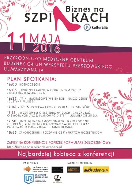 Komisja ds. Dydaktyki działająca z ramienia Samorządu Studentów Uniwersytetu Rzeszowskiego zaprasza do udziału w najbardziej kobiecej z konferencji pt. " Biznes na Szpilkach". Wydarzenie skierowane jest do studentek Uniwersytetu Rzeszowskiego, ale nie tylko. Podczas jego trwania coś dla siebie znajdą również kobiety w różnych grupach wiekowych i o różnym profilu społecznym, które poszukują swojej drogi zawodowej, celu, inspiracji, a także chcą się rozwijać biznesowo. Mamy nadzieję zainspirować te osoby do dalszej aktywnej samorealizacji. Serdecznie zapraszamy do wzięcia udziału w wydarzeniu studentów oraz pracowników Uniwersytetu Rzeszowskiego. Zgłoszenia odbywają się poprzez formularz : https://biznesnaszpilkach.evenea.pl/