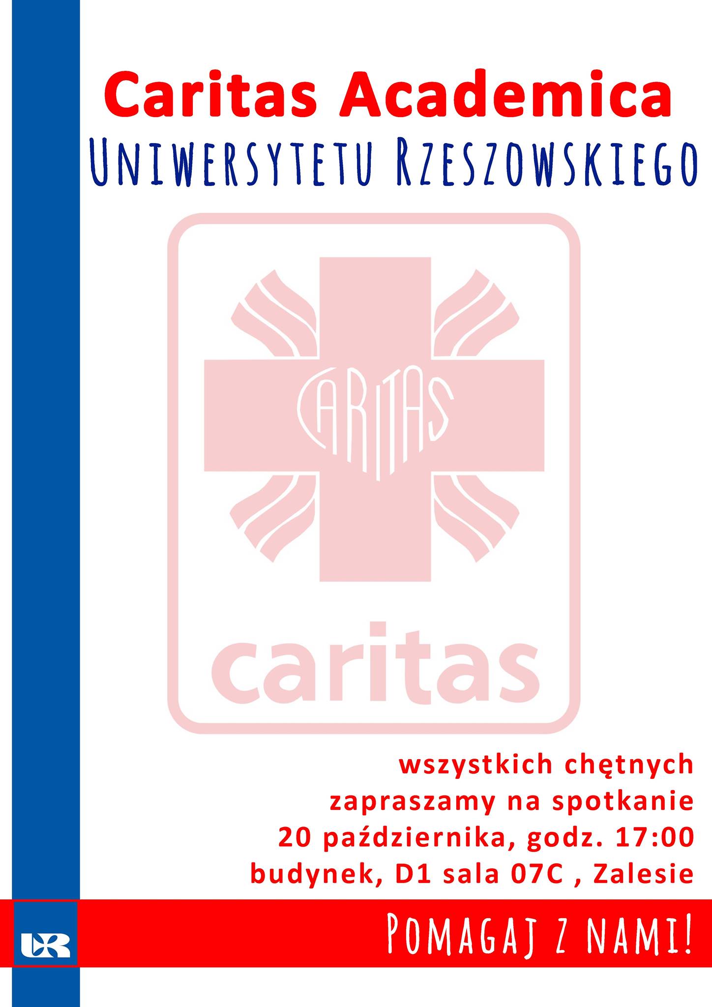 Caritas Academica Uniwersytetu Rzeszowskiego serdecznie zaprasza wszystkich zainteresowanych włączeniem się w działalność organizacji na spotkanie organizacyjne, które odbędzie się w czwartek, 20 października o godzinie 17:00 na terenie Kampusu „Zalesie” (Wydział Biologiczno - Rolniczy) w budynku D1, sala 07C.