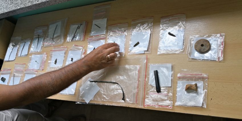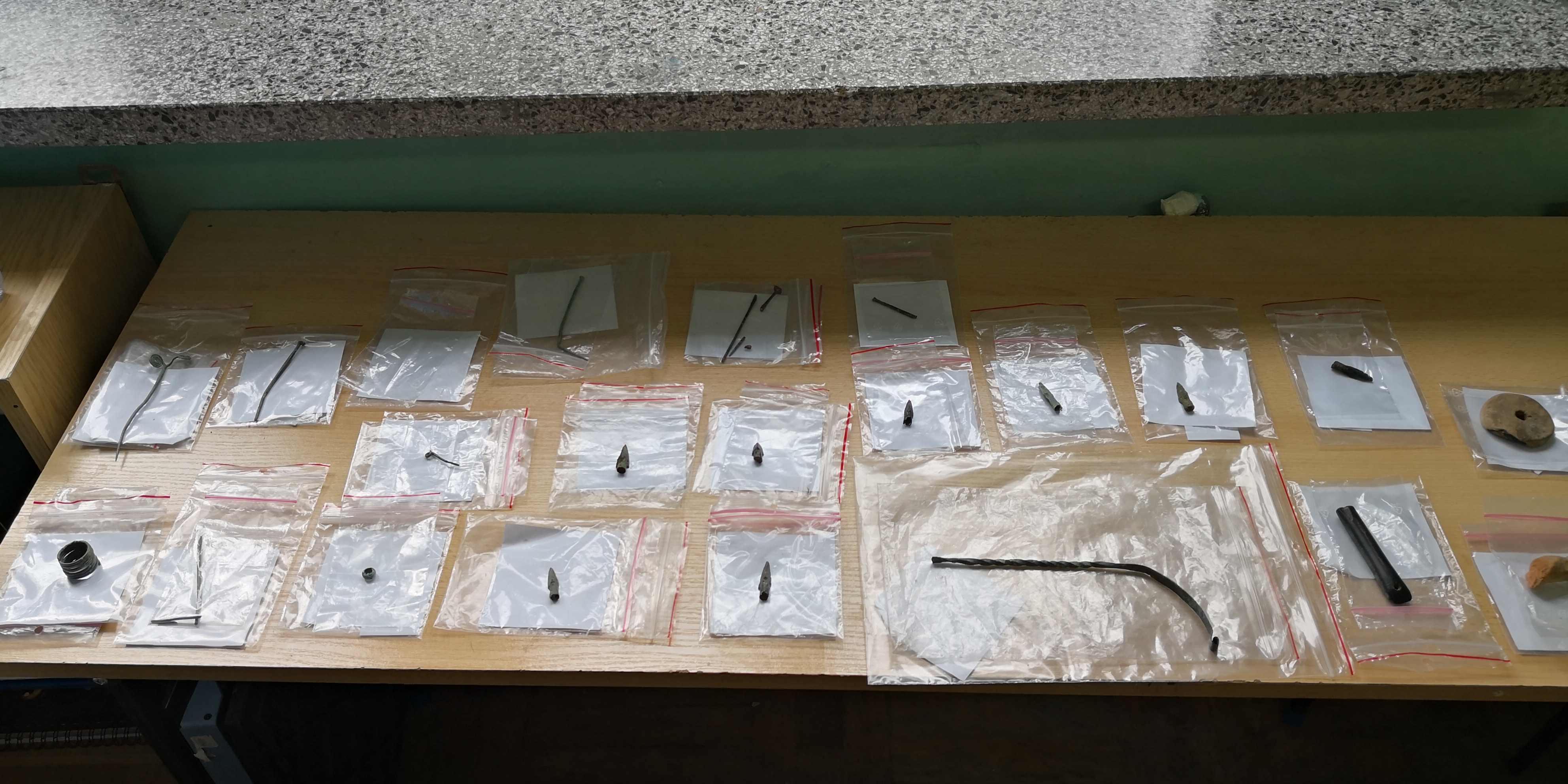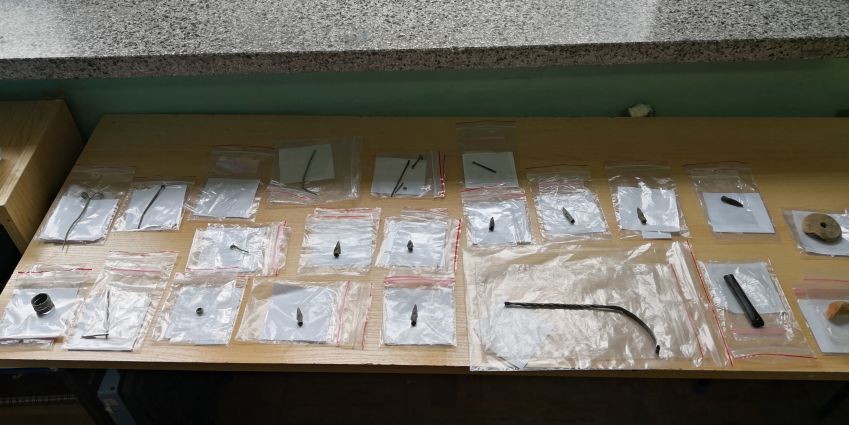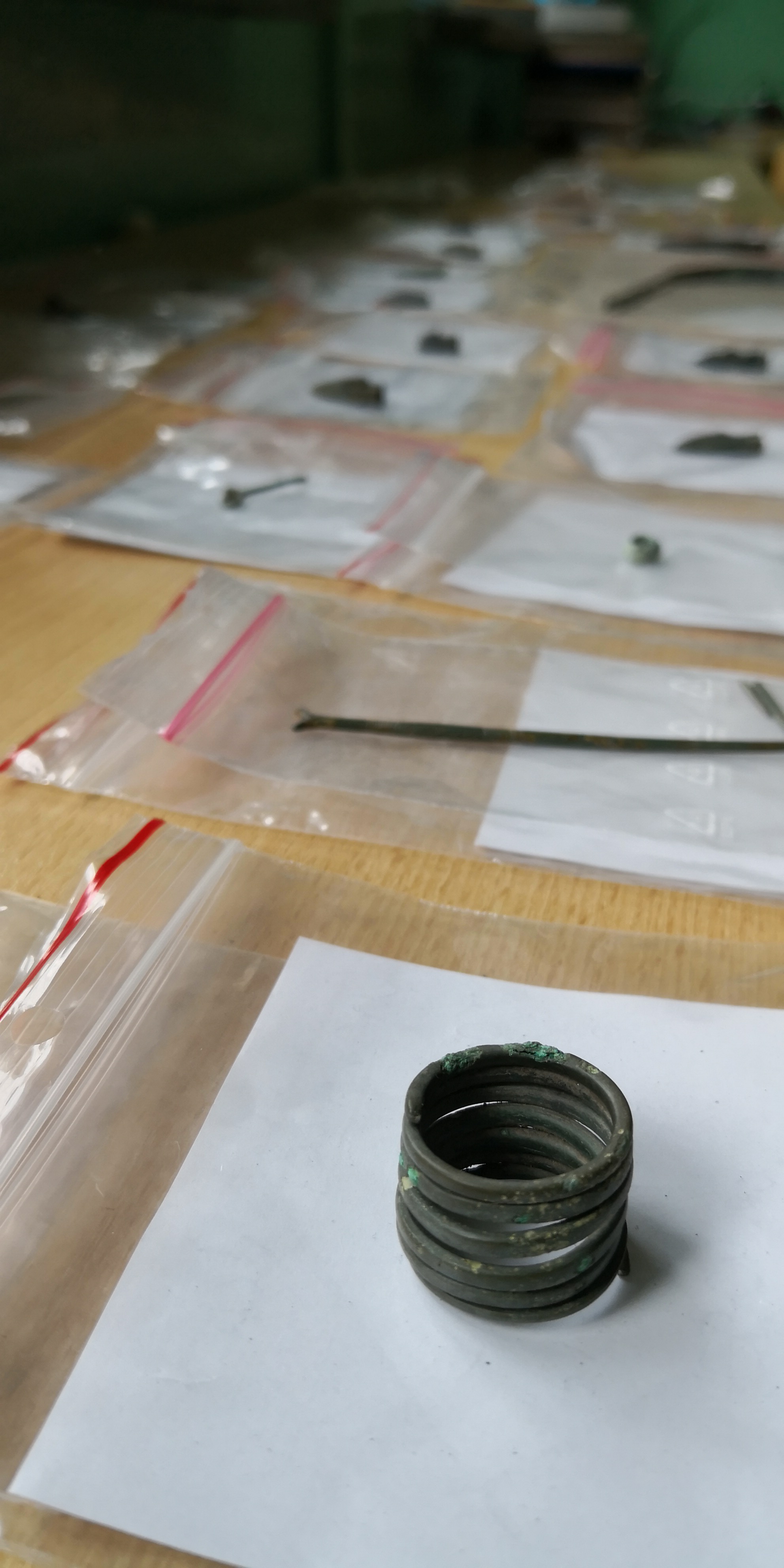 - ozdobami z brązu – szpilami, paciorkami, pierścieniami, dużym fragmentem naszyjnika;