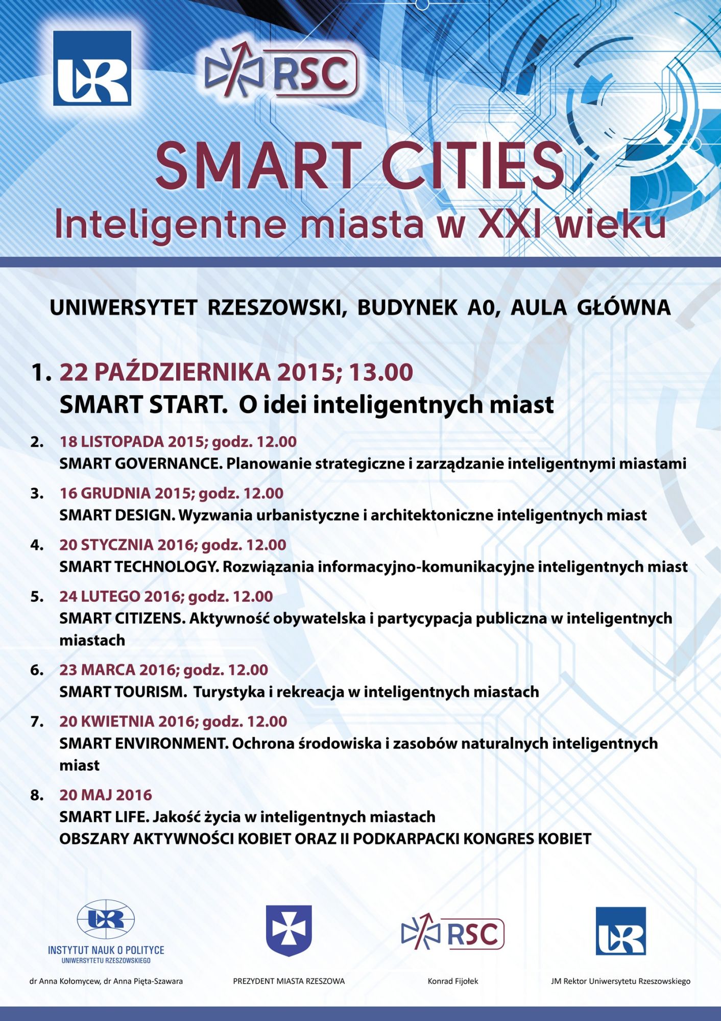 Instytut Nauk o Polityce oraz Ruch Smart Cities zapraszają do udziału w cyklu otwartych spotkań dotyczących idei inteligentnych miast w XXI wieku pt. "Smart Cities". Każde zostanie poświęcone innemu aspektowi ich funkcjonowania. Jeżeli interesują Cię zagadnienia z obszaru zarządzania i planowania w "smart" miastach, wykorzystywane w nich nowoczesne rozwiązania technologiczne, urbanistyczne i planistyczne, rola i partycypacja obywateli oraz kwestie ekologii i jakości życia w miastach przyszłości - dołącz do nas. Na pierwsze spotkanie zapraszamy już 22 października 2015 r., o godz. 13.00 do auli w budynku A0 Uniwersytetu Rzeszowskiego (kampus Rejtana).