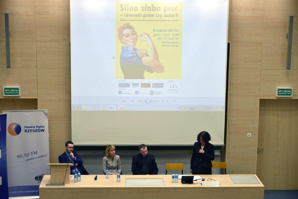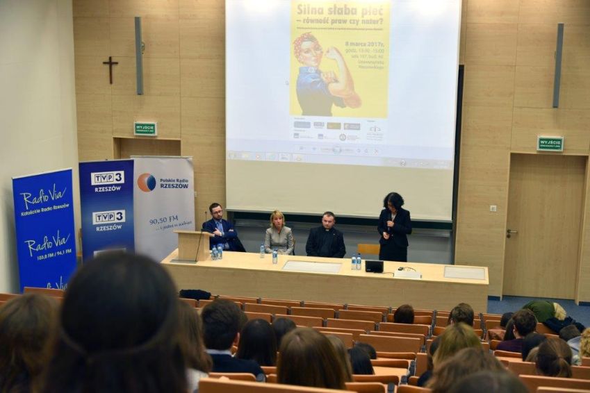8 marca odbyła się poświęcona prawom kobiet w aspekcie konstytucyjnego prawa równości debata akademicka „Silna słaba płeć – równość praw czy natur?” zorganizowana przez Koło Naukowe Prawa Ustrojowego Porównawczego UR. Swoją obecnością zaszczycili nas prelegenci: dr n. prawn. Anna Jacek – współpracownik Wydziału Medycznego, specjalista w zakresie prawa medycznego, dr Ewa Tłuczek-Tadla – nauczyciel akademicki Wydziału Pedagogicznego, specjalność „Edukacja obywatelska”, ks. Jan Kobak – Diecezjalny Duszpasterz Rodzin. Debatę poprowadził dr Grzegorz Maroń – pracownik Wydziału Prawa i Administracji. Po wymianie poglądów zaproszonych Gości studenci mieli okazję podjąć debatę na temat wcześniej omówionych kwestii.