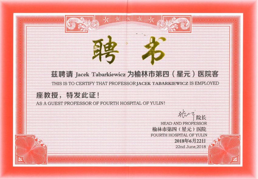 Dr hab. n. med. Jacek Tabarkiewicz prof. UR został mianowany profesorem wizytującym w Fourth Hospital of Yulin, Yulin, Shaanxi Province, Chiny