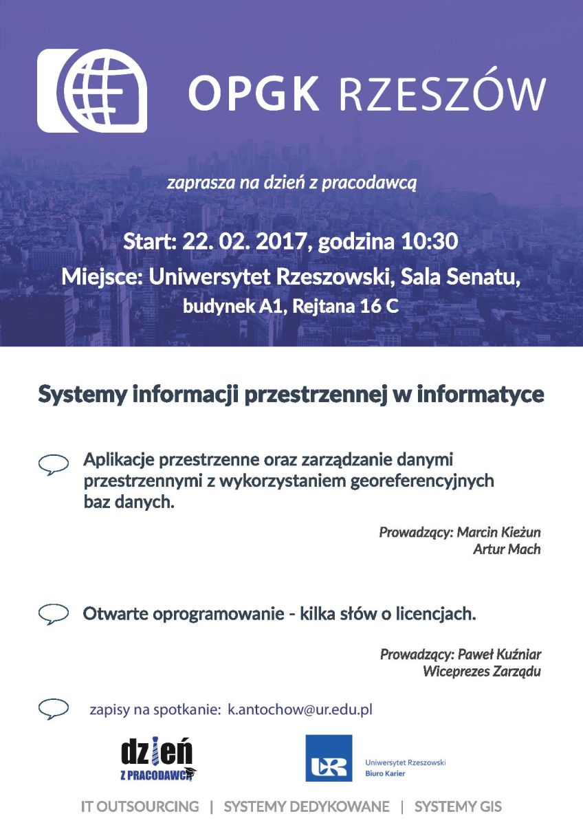 Zapraszamy serdecznie na Dzień z Pracodawcą 22 lutego 2017 od godz. 10:00 w Sali Senatu UR, bud. A 1, Rejtana 16 C podczas którego gościć będziemy znaną i cenioną firmę O P G K RZESZÓW