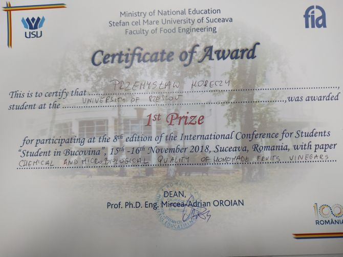 - miejsce Przemysław Horeczy za referat pt. “CHEMICAL AND MICROBIOLOGICAL QUALITY OF HOMEMADE FRUITS VINEGARS” (opiekun – dr Maciej Kluz)