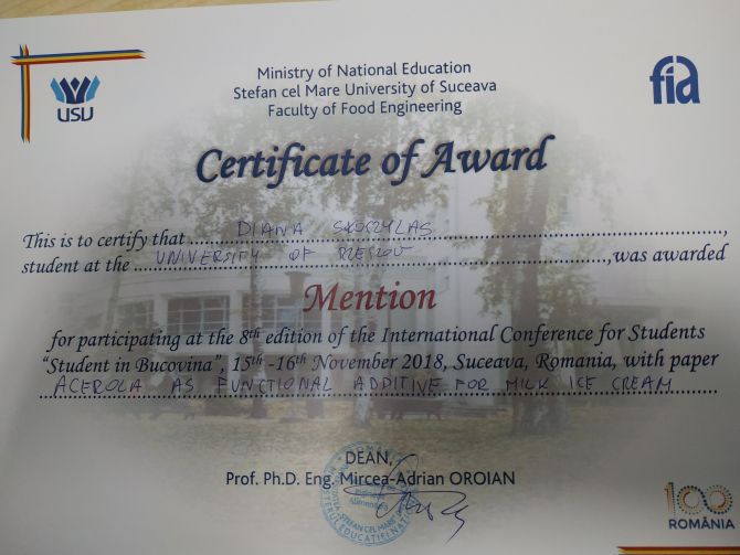 Podczas międzynarodowej konferencji „Students in Bucovina”, która odbywa się w Stefan cel Mare University of Suceava (Rumunia) na Wydziale Technologii Żywności studenci zrzeszeni w SKN Technologów Żywności „FERMENT” działającym na Wydziale Biologiczno – Rolniczym UR w konkursie na najlepsze referaty zajęli następujące miejsca