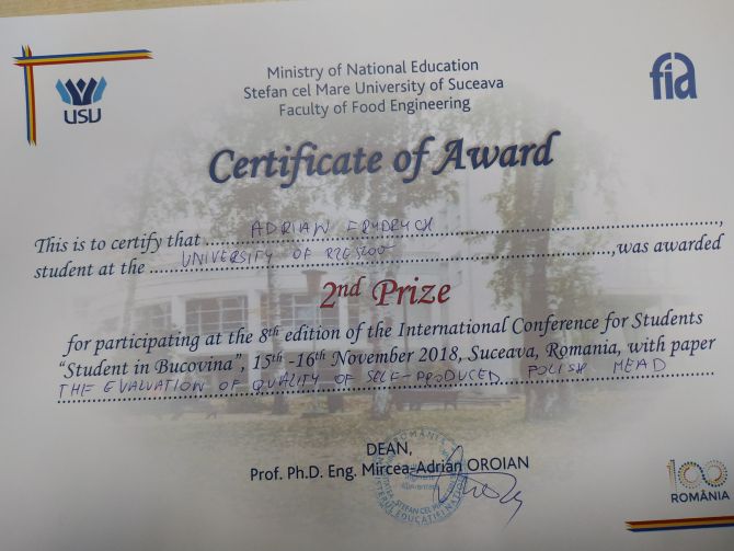 - miejsce Adrian Frydrych za referat pt. „THE EVALUATION OF QUALITY OF SELF-PRODUCED POLISH MEAD” (opiekun – prof. UR Małgorzata Dżugan)