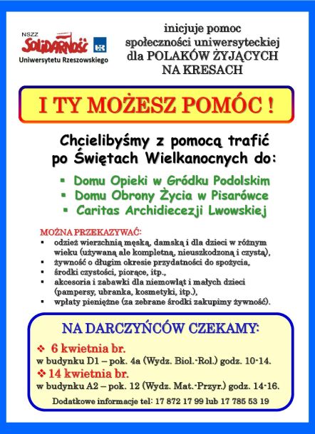 Komisja Uczelniana NSZZ Solidarność UR, działając w imieniu Organizacji Zakładowej NSZZ Solidarność Uniwersytetu Rzeszowskiego podjęła inicjatywę pomocy społeczności uniwersyteckiej dla Polaków żyjących na Kresach (Ukraina).