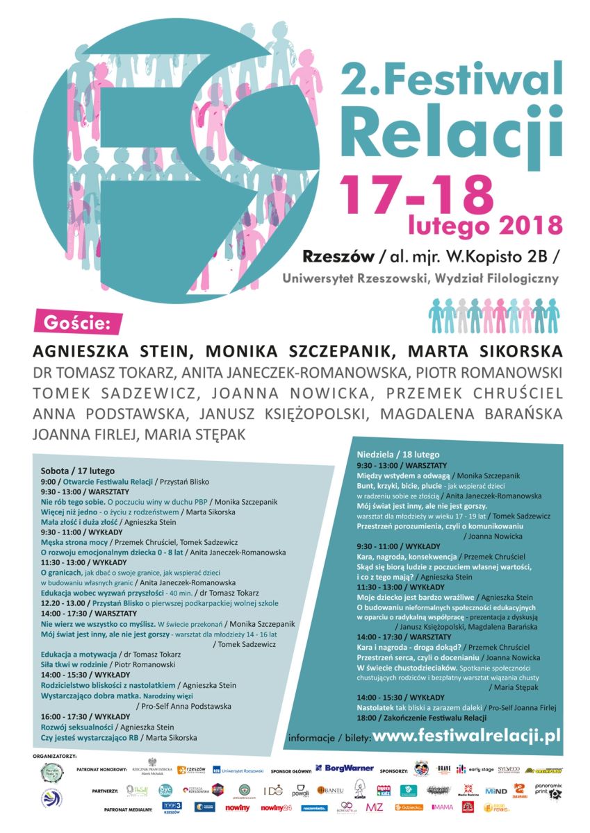 Pierwsza edycja Festiwalu Relacji okazała się niekwestionowanym sukcesem. Dobra organizacja sprawiła, że ilość odwiedzających ponad dwukrotnie przerosła nasze oczekiwania. Dokładamy wszelkich starań, by kolejne odsłony stawały się coraz bardziej przyjazne i ciekawe dla wszystkich odwiedzających – w tym także dla dzieci. Właśnie dla nich przewidzieliśmy mnóstwo atrakcji i warsztatów: kulinarne, muzyczne, chemiczne, które zapewnią nasi partnerzy: Klanza Rzeszów, Pro-Self z warsztatami bajkoterapii, Bystrzaki, Bricks4Kidz i in. Dzieci, będą mogły się bezpiecznie bawić w specjalnej strefie pod opieką animatorów. W hallu obok wygodnej strefy wypoczynkowej znajdzie się stoisko z książkami wydawnictw: Mamania, MiND, Media Rodzina, Zakamarki w specjalnych festiwalowych cenach oraz stoisko z artykułami dla mam i dzieci. Nowością są bezpłatne sesje psychologiczne organizowane przez Pro-Self. Gabinet Masażu i Odnowy Biologicznej Bantu zaproponuje relaksacyjno-odprężający masaż karku oraz masaż dłoni, który sprawi, że ręce będą wrażliwsze na wzajemne relacje. Smakołyki i napoje serwuje Powoli Cafe.