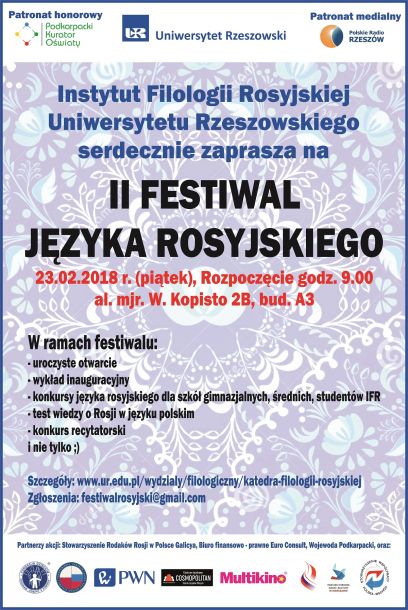 Instytut Filologii Rosyjskiej Uniwersytetu Rzeszowskiego serdecznie zaprasza na II FESTIWAL JĘZYKA ROSYJSKIEGO, który odbędzie się 23.02.2018 r. (piątek) w Instytucie Filologii Rosyjskiej, al. mjr. W. Kopisto 2B, bud. A3. Rozpoczęcie o godz. 9.00.