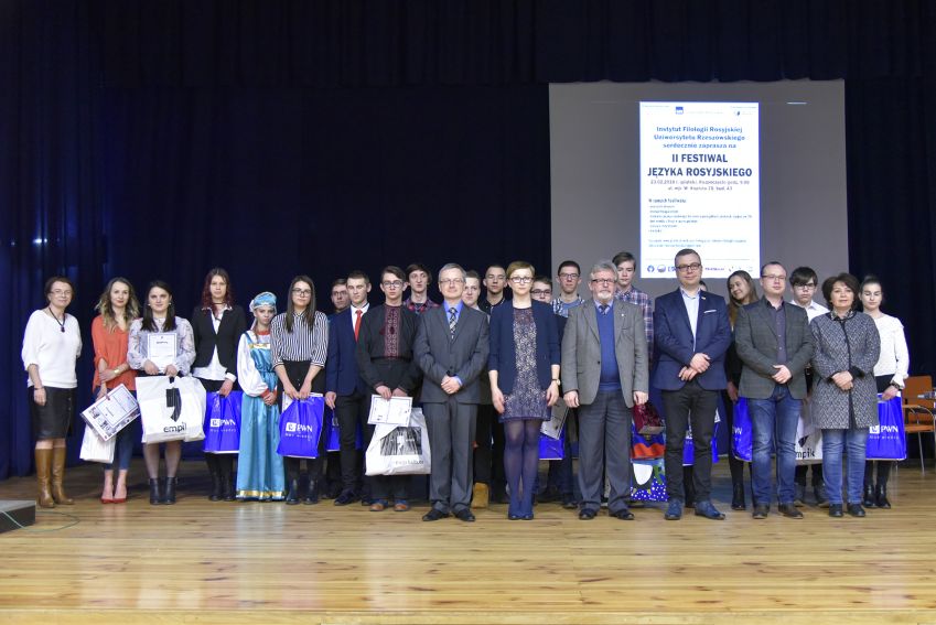 23.02.2018 r. w Instytucie Filologii Rosyjskiej odbył się II Festiwal Języka Rosyjskiego. Wydarzenie obejmowało: wykłady, degustację potraw kuchni rosyjskiej, testy językowe dla uczniów szkół gimnazjalnych, średnich oraz studentów IFR, a także konkurs recytatorski i występy artystyczne studentów IFR. Łącznie w poszczególnych konkursach wzięło udział blisko 100 uczestników. Wśród zaproszonych gości znaleźli się, m. in.: JM Rektor UR, prof. dr hab. Sylwester Czopek, Dziekan wydziału Filologicznego dr hab., prof. UR Zenon Ożóg, Konsul Generalny Federacji Rosyjskiej w Krakowie Aleksandr Minin, Delegacja Rosyjskiego Ośrodka Nauki i Kultury w Warszawie wraz z Kierownikiem departamentu języka rosyjskiego Aleksanderem Dodonowem na czele, Prezes Podkarpackiego Oddziału Stowarzyszenia Współpracy Polska-Wschód Gabriel Zajdel, Prezes Stowarzyszenia Rodaków Rosji w Polsce "GALICYA" Galina Trawkina, Pełnomocnik Wojewody Podkarpackiego do spraw Mniejszości Narodowych i Etnicznych Małgorzata Majka-Onyszkiewicz i inni. Wszyscy uczniowie i studenci otrzymali pamiątkowe dyplomy oraz książki, a zwycięzcy poszczególnych konkursów również cenne nagrody rzeczowe ufundowane przez sponsorów. Zarówno uczestniczący w festiwalu wraz ze swoimi uczniami nauczyciele, jak też zaproszeni goście zgodnie twierdzą, że jest to cenna inicjatywa służąca popularyzacji języka rosyjskiego, która wnosi znaczący wkład w umocnienie rosyjsko-polskich więzi kulturowych.