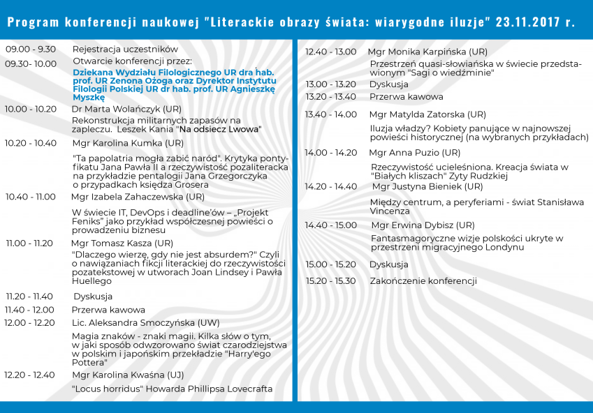 III Ogólnopolska Konferencja Naukowa z cyklu "Literackie obrazy świata: wiarygodne iluzje". Wydarzenie odbędzie się 23.11.2017 r. w bud. A1 UR (obrady w Sali Senatu).