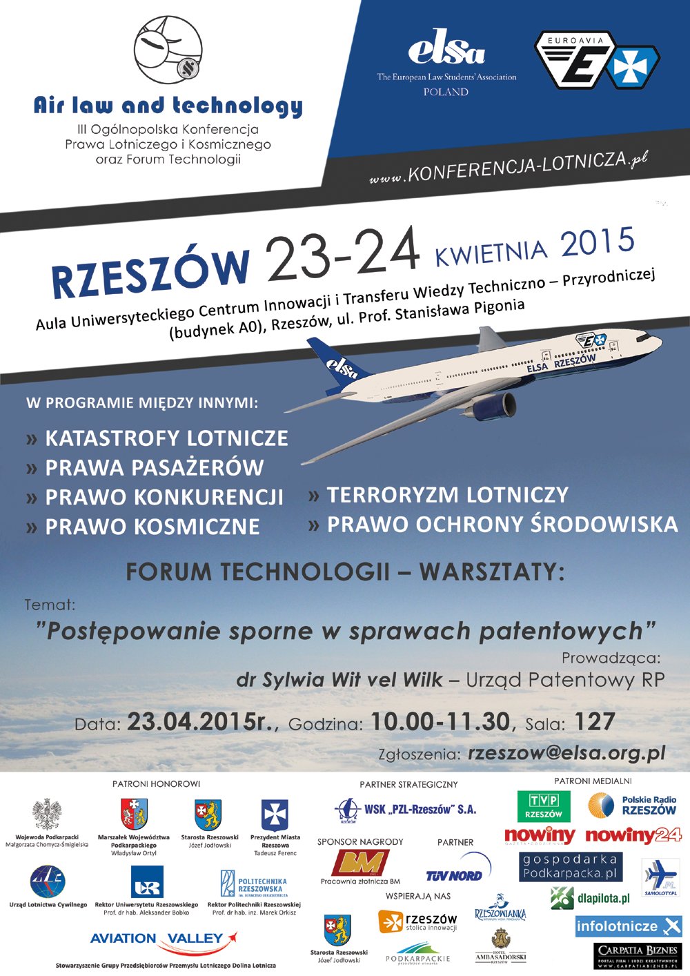 Europejskie Stowarzyszenie Studentów Prawa ELSA Rzeszów wraz z EUROAVIA Rzeszów zapraszają na III Ogólnopolską Konferencję Prawa Lotniczego i Kosmicznego oraz Forum Technologii, która odbędzie się w dniach 23 - 24 kwietnia 2015 roku w budynku Uniwersytetu Rzeszowskiego – Aula Uniwersyteckiego Centrum Innowacji i Transferu Wiedzy Techniczno-Przyrodniczej ul. S. Pigonia 1.
