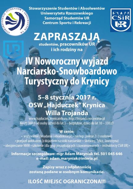 IV Noworoczny wyjazd Narciarsko - Snowboardowo - Turystyczny do Krynicy dla studentów, absolwentów i pracowników UR oraz ich rodzin, który odbędzie się w dniach 5 - 8 stycznia 2017 r.