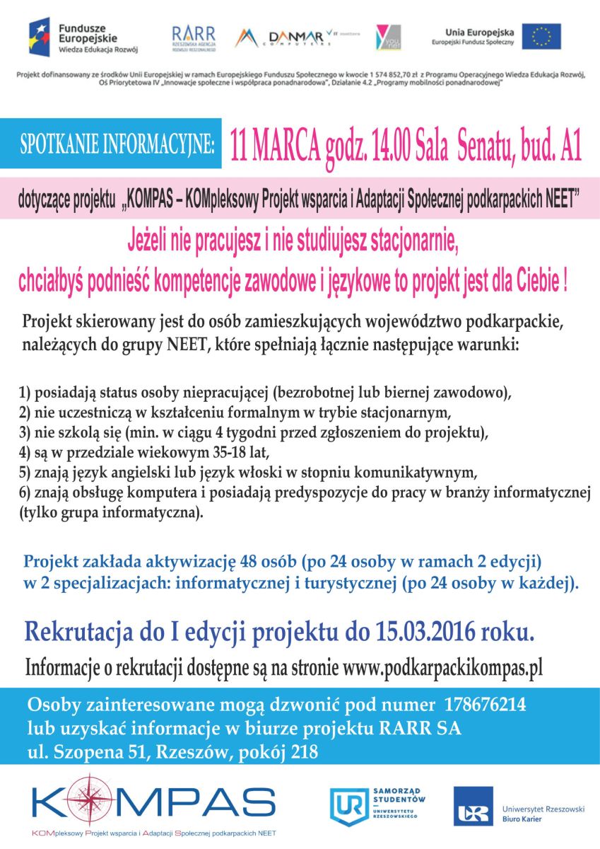 w Sali Senatu , bud. A1, ul. Rejtana 16 C dotyczące projektu „KOMPAS – KOMpleksowy Projekt wsparcia i Adaptacji Społecznej podkarpackich NEET”.