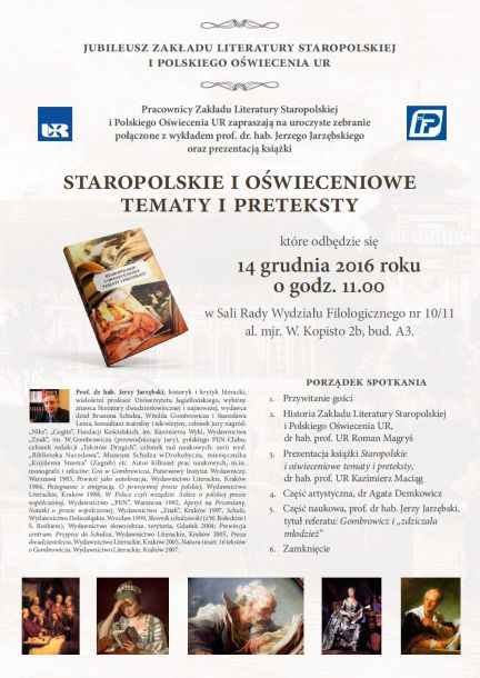 Serdecznie zapraszamy na uroczyste obchody Jubileuszu Zakładu Literatury Staropolskiej i Polskiego Oświecenia UR połączone z wykładem prof. dr. hab. Jerzego Jastrzębskiego oraz prezentacją książki "STAROPOLSKIE I OŚWIECENIOWE TEMATY I PRETEKSTY".