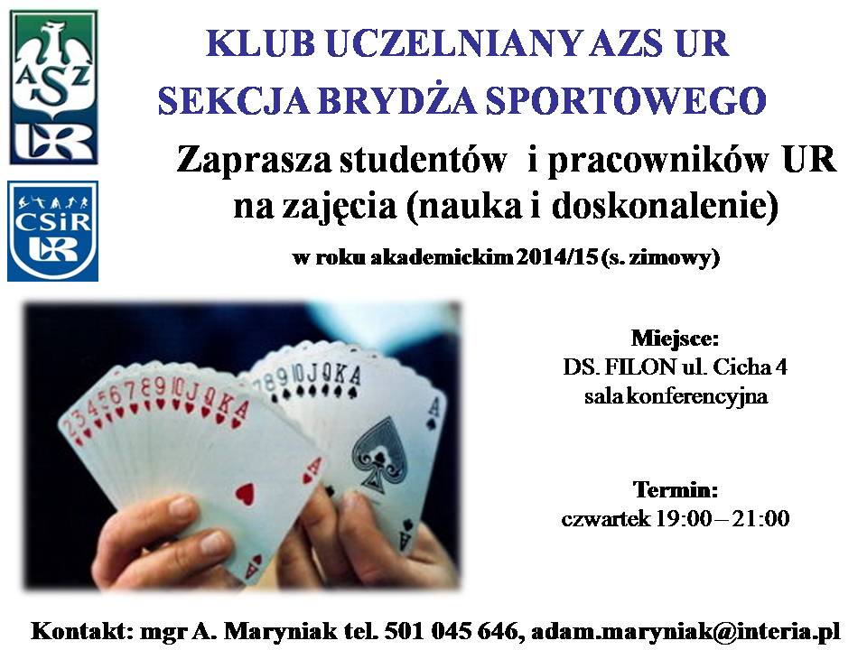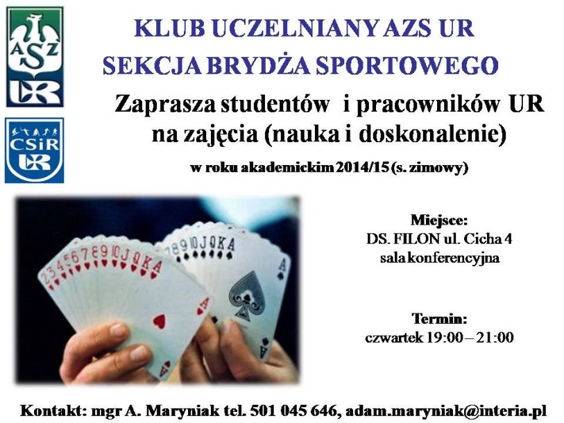Klub Uczelniany AZS Uniwersytetu Rzeszowskiego oraz Centrum Sportu i Rekreacji Uniwersytetu Rzeszowskiego zapraszają studentów i pracowników UR na zajęcia Sekcji Brydża Sportowego w roku akademickim 2