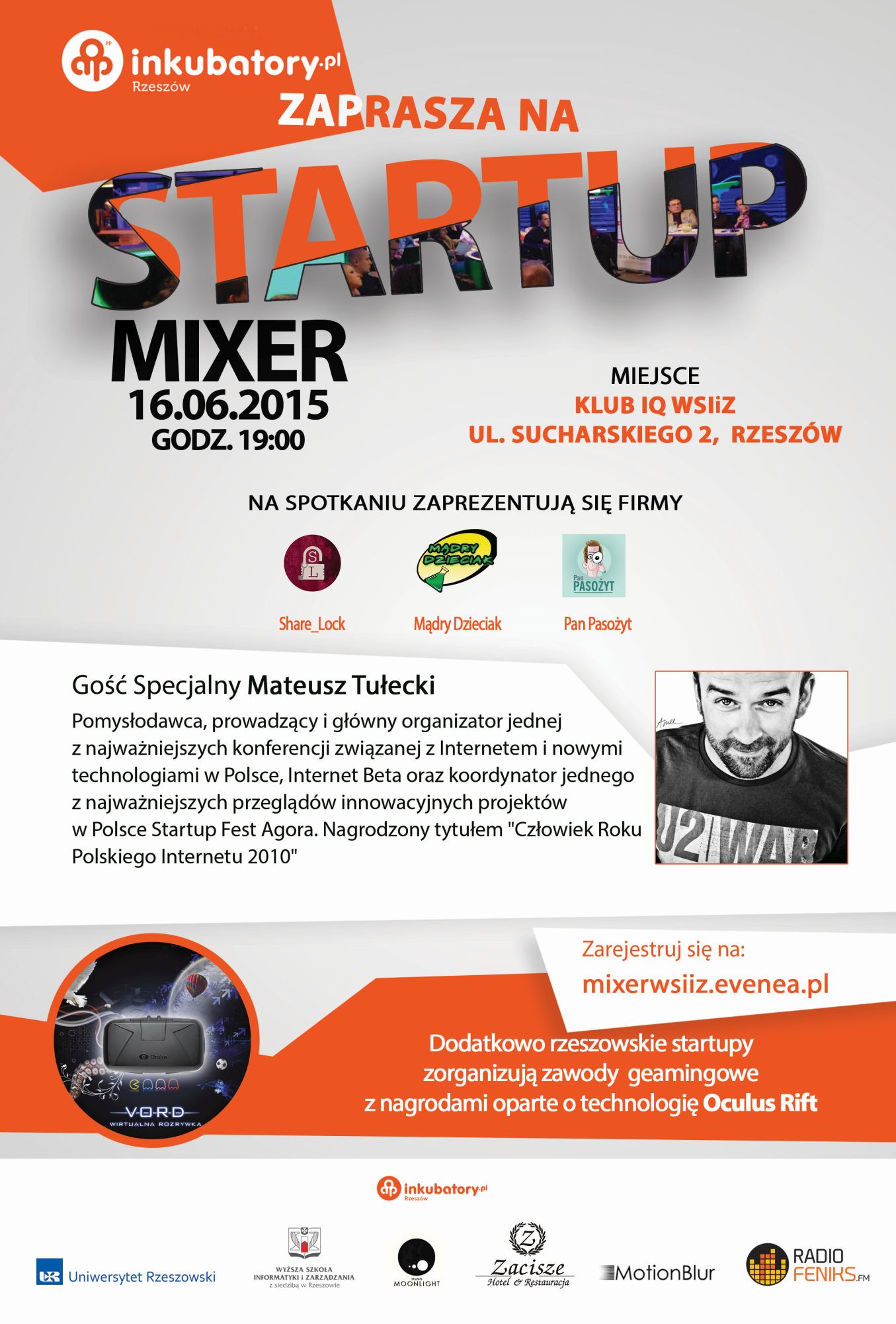 Gośćmi najbliższego spotkania będą Mateusz Tułecki - pomysłodawca, prowadzący i główny organizator jednej z najważniejszych konferencji związanej z Internetem i nowymi technologiami w Polsce, Internet Beta oraz koordynator jednego z najważniejszych przeglądów innowacyjnych projektów w Polsce - Startup Fest Agora. Nagrodzony tytułem „Człowiek Roku Polskiego Internetu 2010”.
