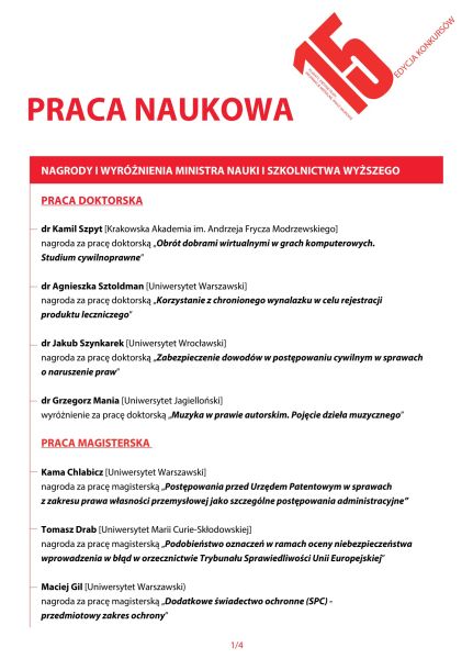 Praca doktorska Pana Kamila Szpyta, której promotorem był Pan Profesor Mariusz Załucki zdobyła kolejną nagrodę. Tym razem Pan dr zdobył główną nagrodę w XV. edycji Konkursu organizowanego przez Urząd Patentowy RP na najlepszą pracę naukową na temat własności intelektualnej.