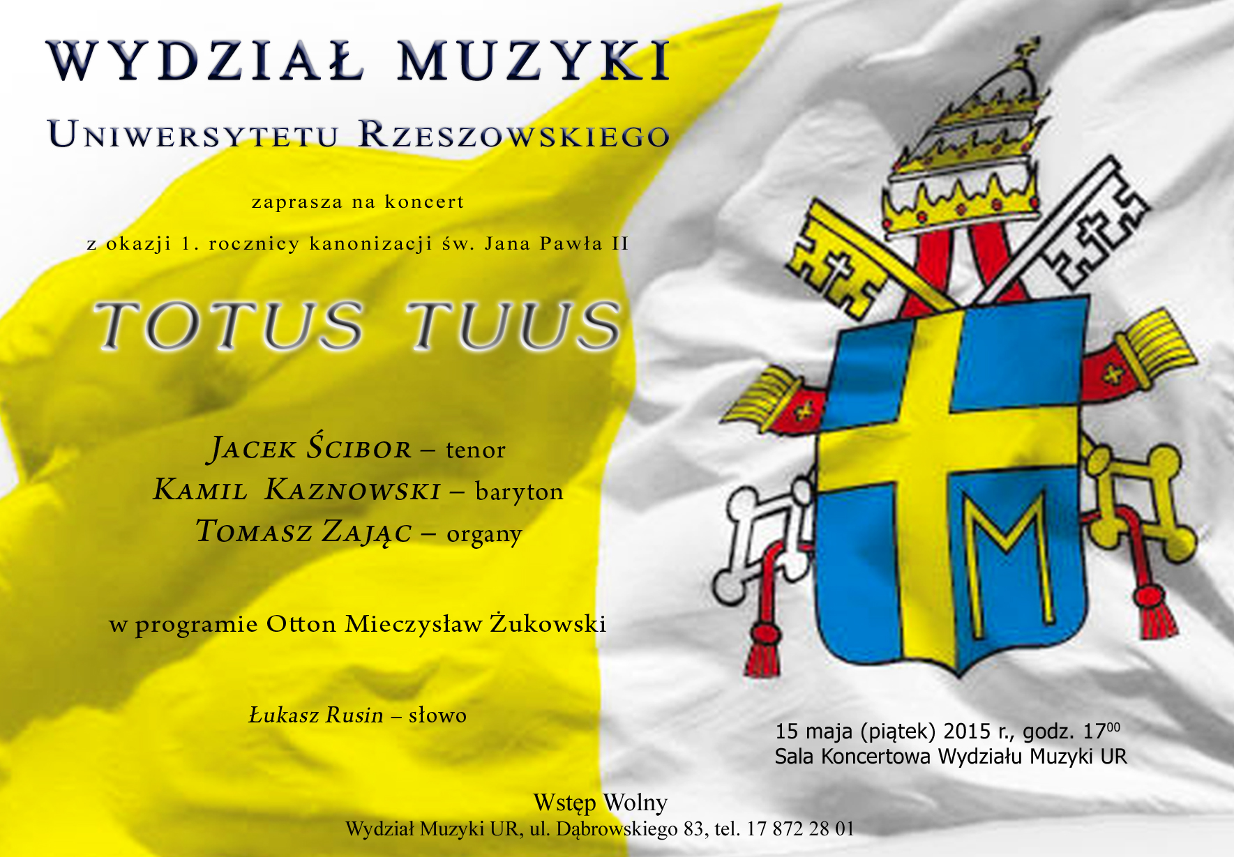 Koncert zatytułowany „ TOTUS TUUS” upamiętnia I rocznicę kanonizacji św. Jana Pawła II. W programie usłyszymy utwory polskiego kompozytora Ottona Mieczysława Żukowskiego w wykonaniu: Jacka Ścibora, Kamila Kaznowskiego, Tomasza Zająca. Całość poprowadzi Łukasz Rusin.