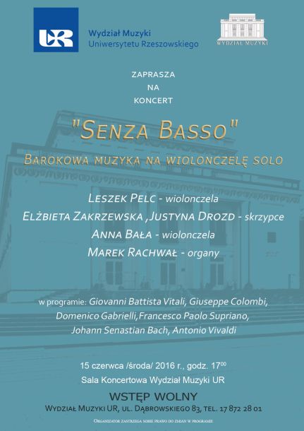 Koncert z cyklu "Zawsze piętnastego, ..." - "Senza Basso" Barokowa muzyka na wiolonczele. 15.06.2016 r., godz. 17.00