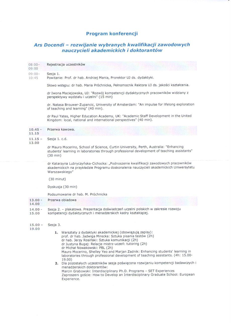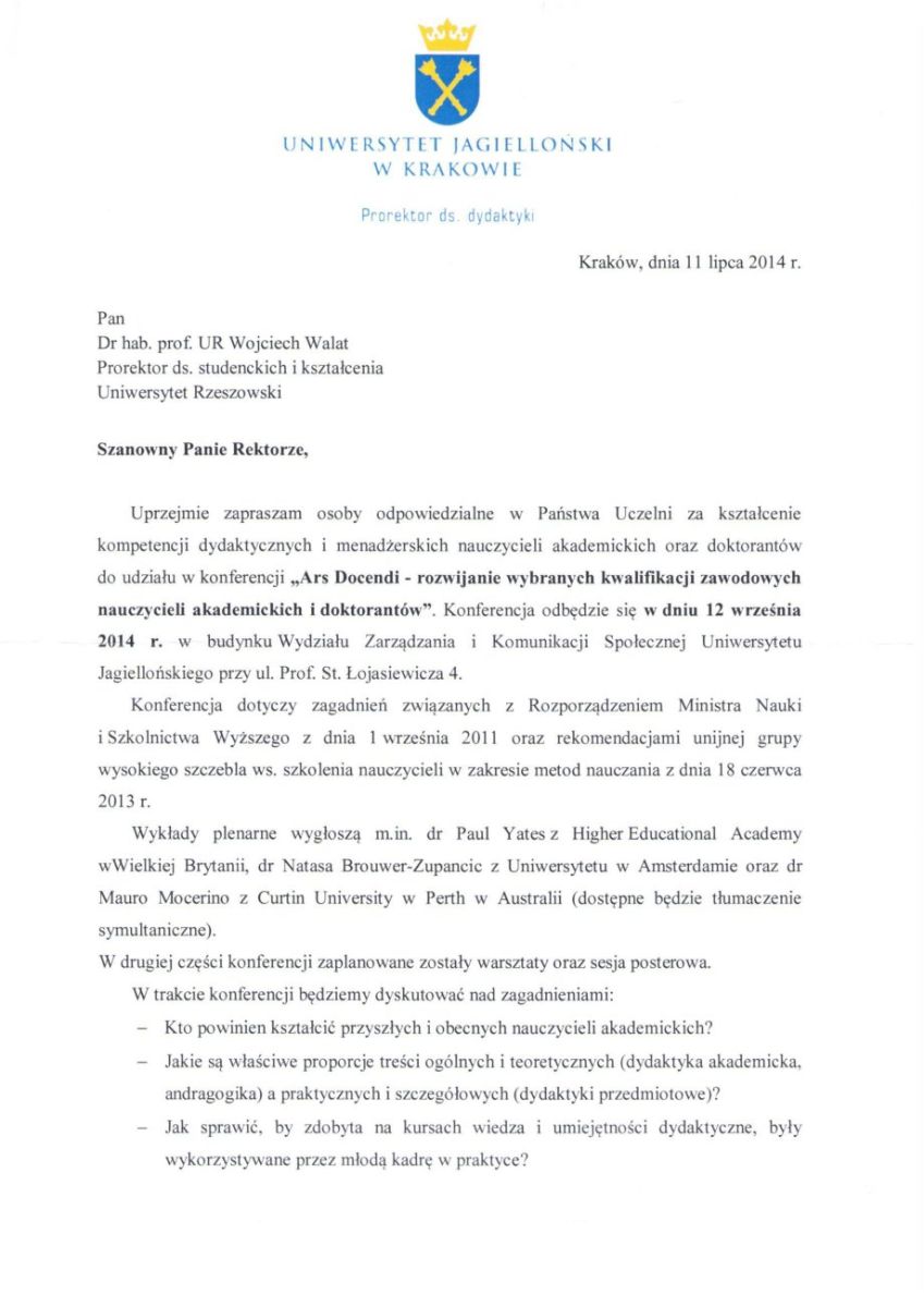 W związku z Rozporządzeniem Ministra Nauki i Szkolnictwa Wyższego z dnia 1 września 2011 oraz rekomendacjami unijnej grupy wysokiego szczebla ws. szkolenia nauczycieli w zakresie metod nauczania z dnia 18 czerwca 2013 r., serdecznie zapraszamy osoby zainteresowane kształceniem dydaktycznym doktorantów oraz podnoszeniem kompetencji dydaktycznych kadry kształcącej Państwa uczelni do udziału w jednodniowej konferencji "Ars Docendi - rozwijanie wybranych kwalifikacji zawodowych nauczycieli akademickich i doktorantów", która odbędzie się w dniu 12 września (w godz. 9.00-18.00) na Uniwersytecie Jagiellońskim w Krakowie.