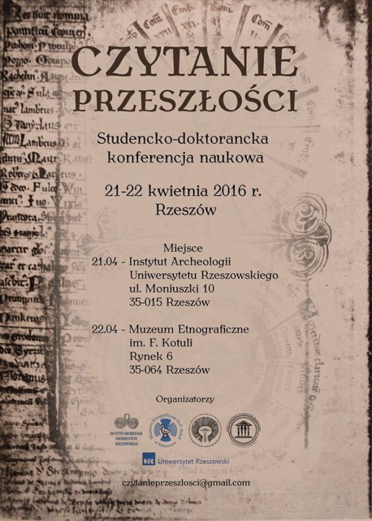 Koło Naukowe Studentów Archeologii oraz Koło Naukowe Studentów Muzeologii Uniwersytetu Rzeszowskiego, przy udziale Instytutu Archeologii Uniwersytetu Rzeszowskiego i Muzeum Etnograficznego w Rzeszowie, ma zaszczyt zaprosić na studencko-doktorancką konferencję naukową ”Czytanie przeszłości”, która odbędzie się w dniach 21-22 kwietnia 2016 r. w Rzeszowie.