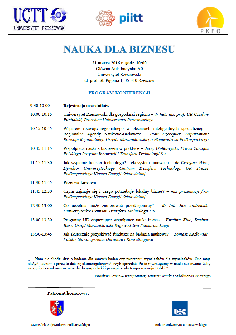 Uniwersyteckie Centrum Transferu Technologii UR, Podkarpacki Klaster Energii Odnawialnej oraz Polski Instytut Innowacji i Transferu Technologii S.A. serdecznie zapraszają do udziału w konferencji pn. „Nauka dla biznesu”, organizowanej w dniu 21 marca 2016 roku. Konferencja odbędzie się w Auli Głównej budynku A0 Uniwersytetu Rzeszowskiego przy ul. Pigonia 1 w Rzeszowie.