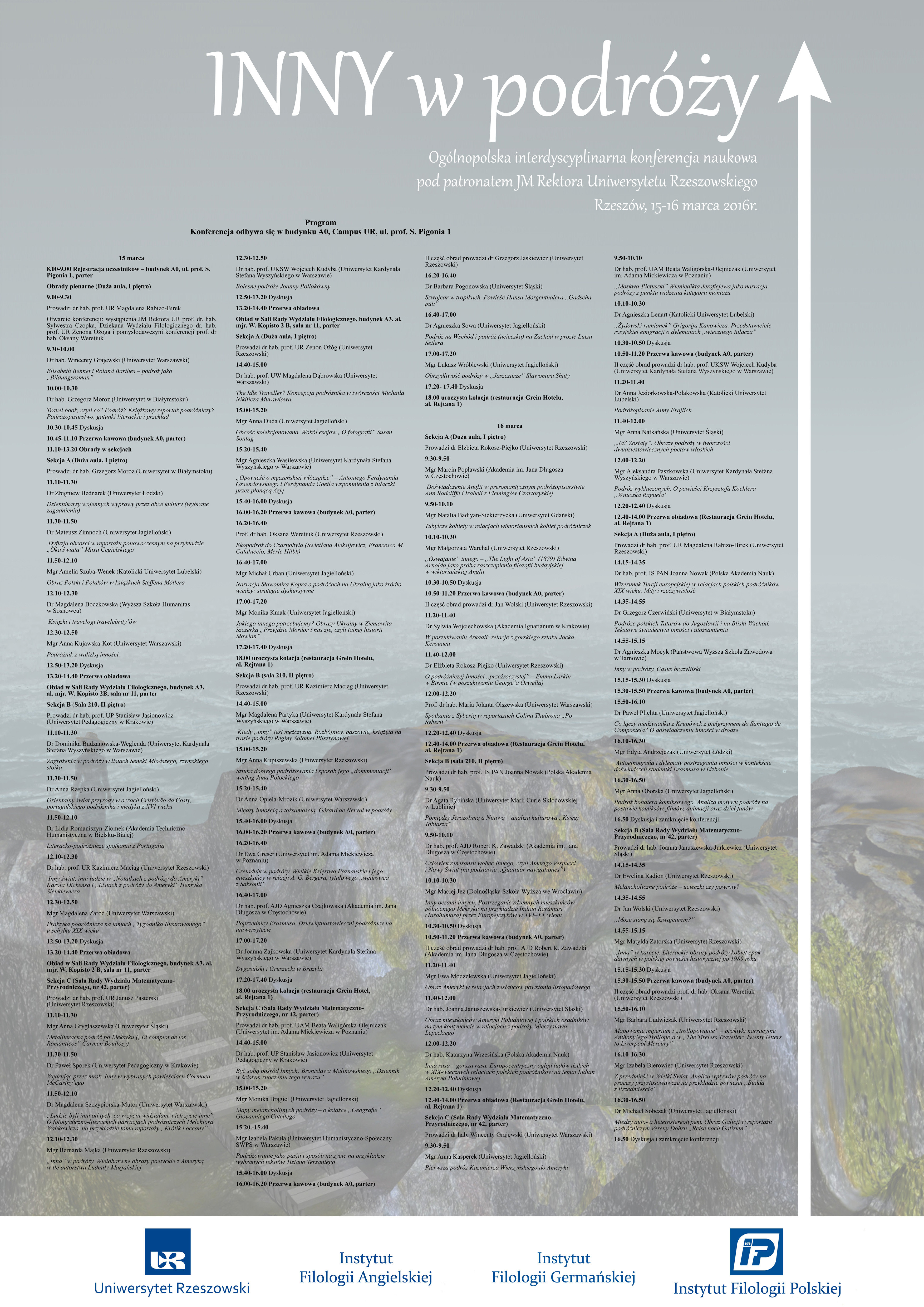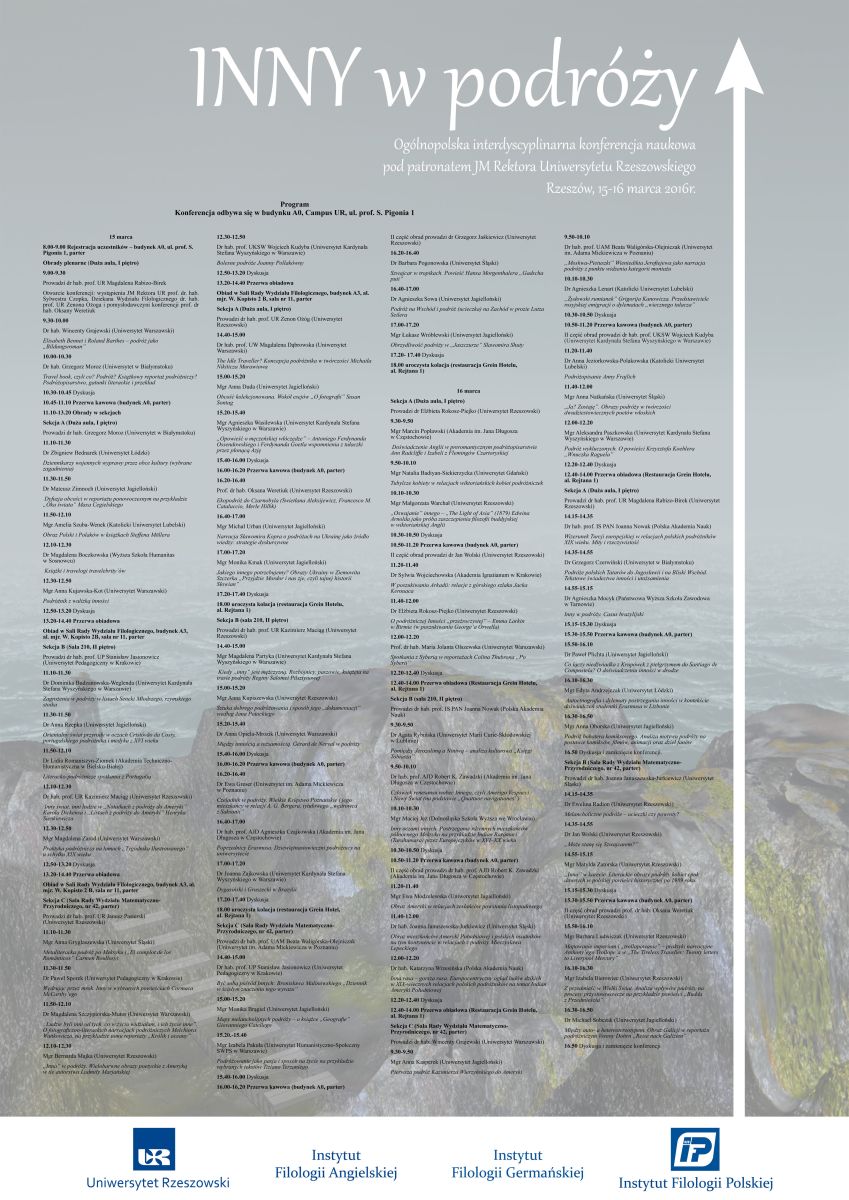 W dniach 15-16 marca 2016r. odbędzie się ogólnopolska interdyscyplinarna konferencja naukowa "Inny w podróży" pod patronatem JM Rektora Uniwersytetu Rzeszowskiego, zorganizowana przez Wydział Filologiczny UR, Instytut Filologii Angielskiej, Instytut Filologii Germańskiej oraz Instytut Filologii Polskiej.