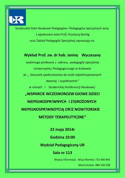 Studenckie Koło Naukowe Pedagogów i Pedagogów Specjalnych wraz z opiekunem Koła Prof. Krystyną Barłóg oraz Zakład Pedagogiki Specjalnej zapraszają na KONFERENCJĘ NAUKOWĄ dla osób zainteresowanych problematyką wczesnego wspomagania rozwoju