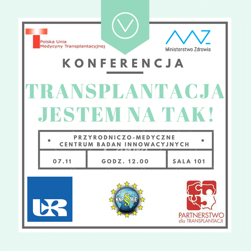 Koło Naukowe Prawa Międzynarodowego i Europejskiego, Uniwersytet Rzeszowski, Ministerstwo Zdrowia oraz Stowarzyszenie Polska Unia Medycyny Transplantacyjnej serdecznie zapraszają na Konferencję "Transplantacja - jestem na tak!", która odbędzie się 7 listopada 2016 r. o godz. 12.00 w Przyrodniczo-Medycznym Centrum Badań Innowacyjnych.