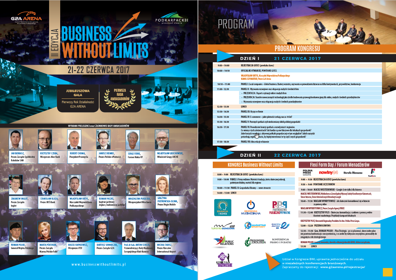 Business Without Limits to unikatowe wydarzenie na mapie kongresowej Polski. Pierwsza edycja, która miała miejsce w grudniu 2016, była dużym sukcesem – zgromadziła blisko 1000 uczestników, którzy uczestniczyli w prelekcjach, dyskusjach i spotkaniach w wyjątkowym otoczeniu G2A Areny, Centrum Wystawienniczo – Kongresowego Województwa Podkarpackiego.