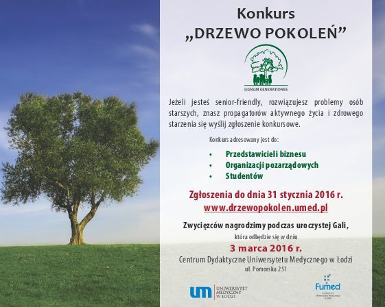 Uniwersytet Medyczny w Łodzi oraz Fundacja dla Uniwersytetu Medycznego w Łodzi, w ramach platformy EIT Health Poland, ogłaszają konkurs Drzewo Pokoleń dedykowany firmom, instytucjom, a także studentom realizującym projekty w obszarze zdrowego życia i aktywnego starzenia się. Celem konkursu jest uhonorowanie liderów w tym obszarze, wymiana dobrych praktyk i integracja różnych podmiotów dostarczających produkty, usługi i rozwiązania, które przyczyniają się do poprawy jakości życia seniorów.