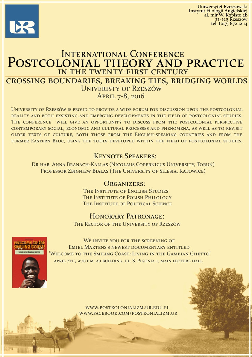 Organizatorzy konferecji Postcolonial Theory and Practice in the Twenty-First Century, Crossing Boundaries, Breaking Ties, Bridging Worlds serdecznie zapraszają do udziału w obradach, które odbywać się będą w dniach 7 i 8 kwietnia 2016 roku na Uniwersytecie Rzeszowskim (Wydział Filologiczny). Celem konferencji jest stworzenie płaszczyzny do dyskusji na temat rzeczywistości postkolonialnej oraz najnowszych trendów w badaniach postkolonialnych. Referaty z zakresu socjologii, antropologii, historii, kulturoznawstwa oraz literaturoznawstwa dotyczyć będą przede wszystkim interpretacji procesów zachodzących we współczesnym świecie, postrzeganych w perspektywie teorii postkolonialnych. W związku z międzynarodowym charakterem tego wydarzenia językiem obrad będzie język angielski. Uroczyste otwarcie konferencji nastąpi 7 kwietnia o godzinie 9.30 w dużej auli budynku A0. Ciąg dalszy obrad w budynku A3.
