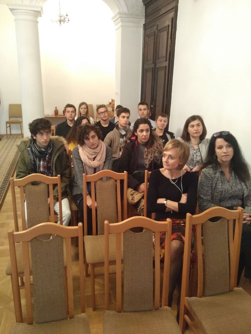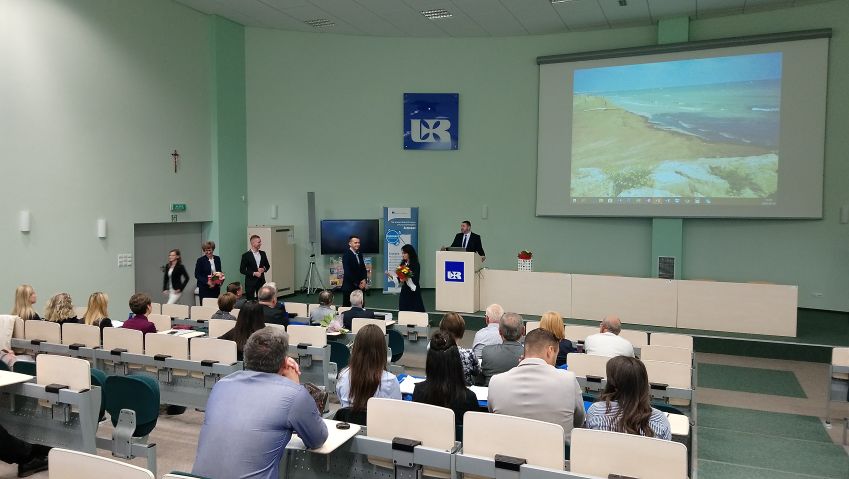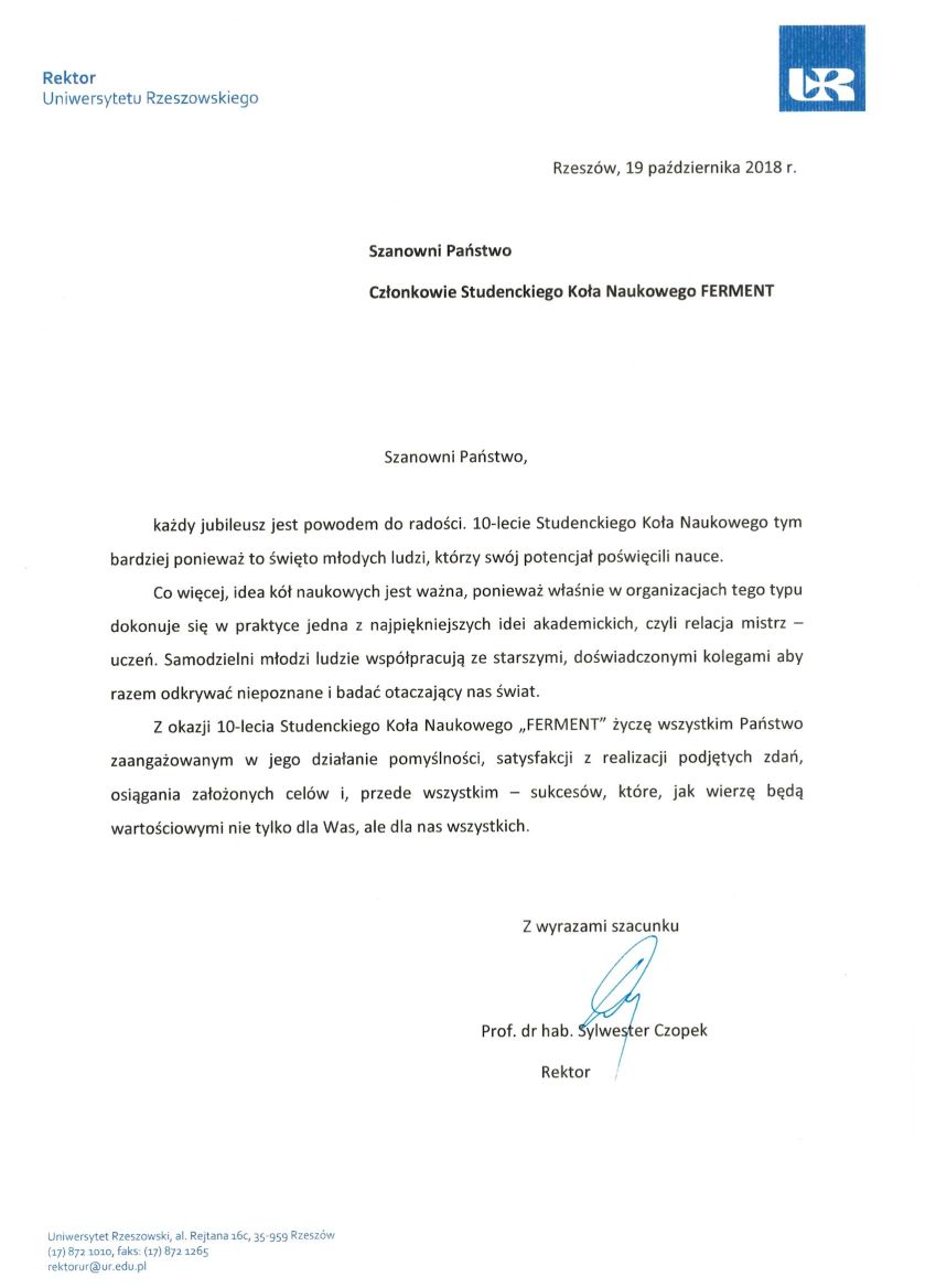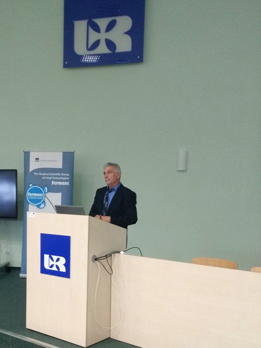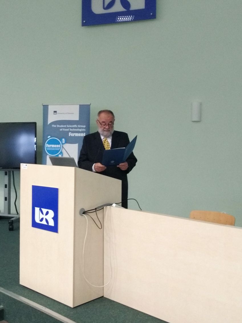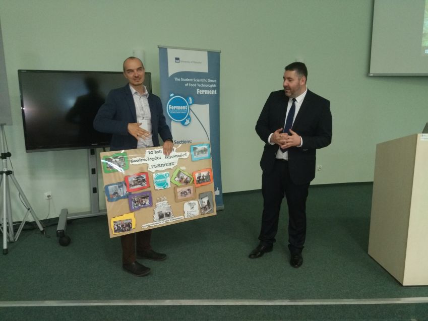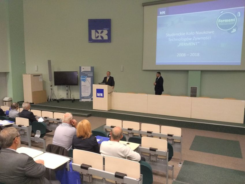 Następnie Prorektor ds. Nauki i Współpracy z Zagranicą Prof. dr hab. Marek Koziorowski złożył gratulację z okazji 10 – lecia działalności koła i życzył dalszych sukcesów, jednocześnie podkreślił bogatą i aktywną działalność koła, podziękował również opiekunowi koła dr Maciejowi Kluz za jego zaangażowanie i działalność w „Fermencie”. Następnie Pan Prorektor odczytał list skierowany do członków SKN TŻ „FERMENT” przez J.M. Rektora Uniwersytetu Rzeszowskiego prof. dr hab. Sylwestra Czopka. Opiekun koła przedstawił Panu Prorektorowi ponad 1000 stronnicowe sprawozdanie z działalności koła zawierające wszystkie publikacje, doniesienia konferencyjne i pozostałe aktywności jego członków oraz podziękował władzom rektorskim za wieloletnie wsparcie.. W kolejnym wystąpieniu Dziekan Wydziału Biologiczno – Rolniczego Prof. dr hab. inż. Czesław Puchalski złożył gratulację z okazji jubileuszu koła i życzył dalszych sukcesów. Dr Maciej Kluz podziękował Panu Dziekanowi za możliwość pracy koła w murach wydziału, a także za stworzenie bazy naukowej, dzięki której poziom badań prowadzonych przez studentów wzrósł do poziomu międzynarodowego. Następnie opiekun przedstawił sprawozdanie z 10- letniej działalności koła. Kolejna część „podziękowań” była bardzo uroczysta i odbywała się w rodzinnej atmosferze jaka panuje w kole. Opiekun koła dziękował osobom zasłużonym dla koła „FERMENT” przede wszystkim władzom rektorskim i dziekańskim, a także przybyłym zaproszonym gościom: prof. Marii Drobie, Dziekanowi Wydziału Biotechnologii i Nauk o Żywności Słowackiego Uniwersytetu Rolniczego w Nitrze prof. Janowi Tomasowi, doc. dr Adrianowi Timarowi kierownikowi Instytutu Nauk o Żywności w University of Oradea, prof. Lesławowi Juszczakowi redaktorowi naczelnemu czasopisma „Żywność. Nauka. Technologia. Jakość”, przedstawicielom Instytutu Winiarstwa z Vinniczek – Pani dyrektor Mgr. Blaženie Číkošovej, Pani kierownik Agnesie Petrickovej i Panu Peterowi Bodnarowi, prof. Andrzejowi Sybirnemu, dr hab., prof. UR Włodzimierzowi Sybirnemu, dr hab. inż., prof. UR Józefowi Gorzelanemu, dr inż. Katarzynie Marciniak – Łukasiak z SGGW, a także pracownikom WBR zasłużonym dla koła naukowego. Szczególne, emocjonalne i ciepłe podziękowanie dr Maciej Kluz skierował do dr hab. inż., prof. UR Małgorzaty Dżugan (opiekun Sekcji Chemii i Toksykologii Żywności) z którą od 10 lat współprowadzi koło naukowe, a także do dr hab. inż., prof. UR Agaty Znamirowskiej (opiekun Sekcji Mleczarstwa) za pomoc w prowadzeniu koła i wieloletnie wsparcie. Na koniec części oficjalnej nieoczekiwanie weszła grupa absolwentów w osobach: Maciej Kurcz, Tomasz Rusin, Ewa Śliwka, Urszula Szczepan, którzy 10 lat temu w dniu 21.10.2008 r. założyli „FERMENT”. Wzbudziło to ogromną radość całej auli, a Pan Dziekan poprosił ich o opowiedzenie ich losów po ukończeniu studiów.