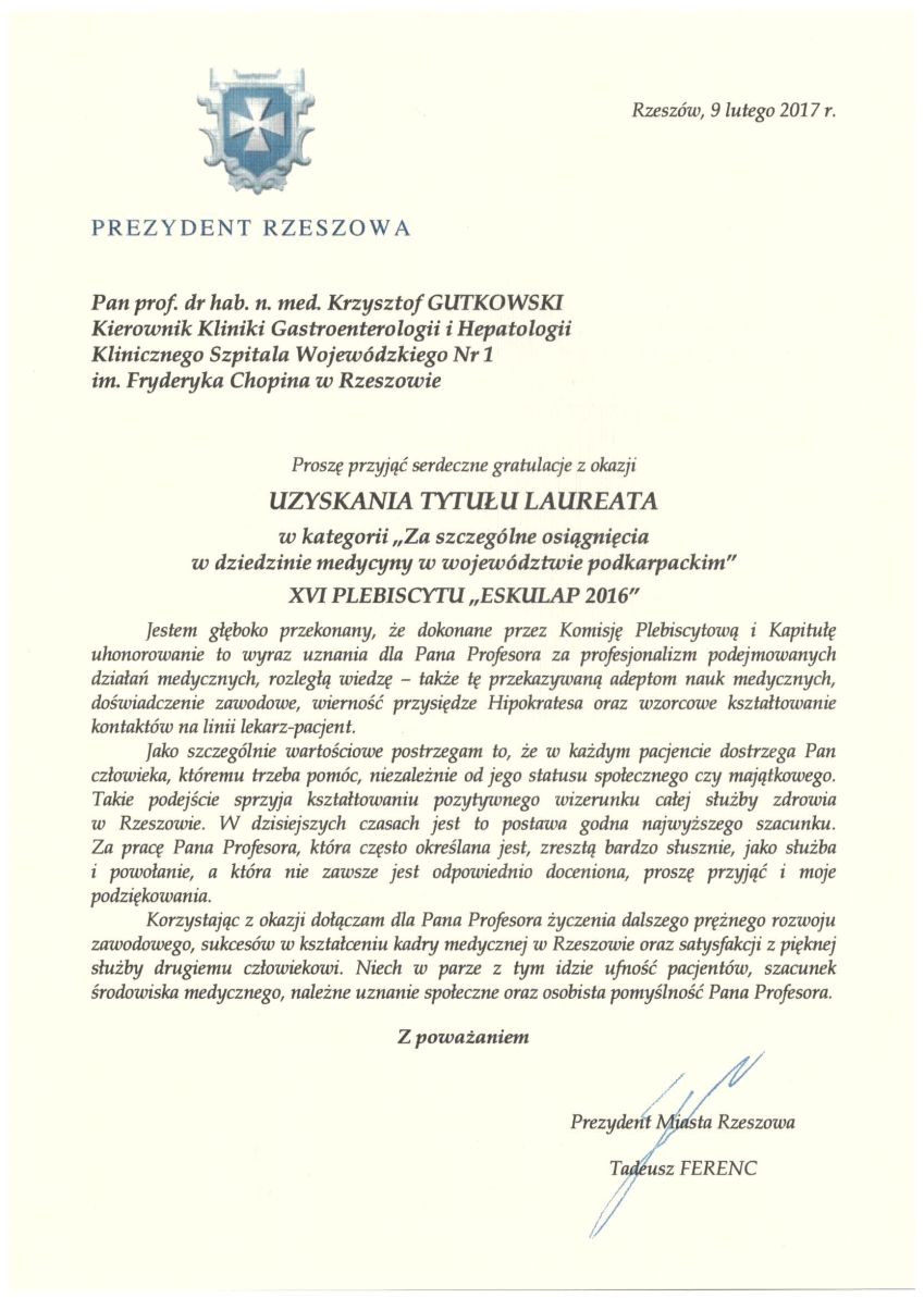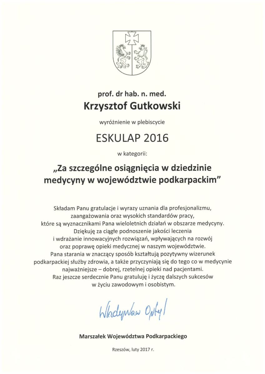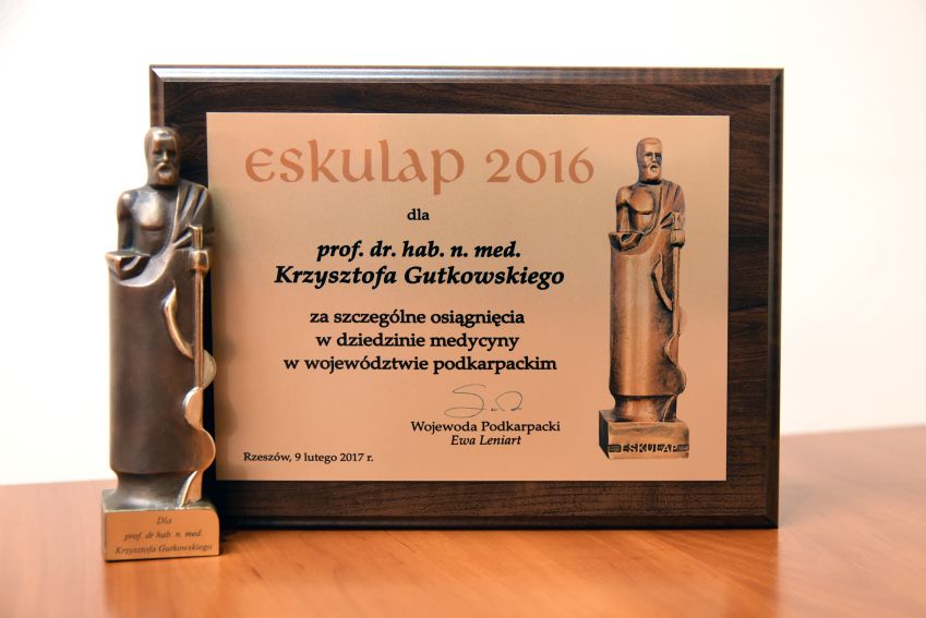 Jest nam niezmiernie miło poinformować, że Kapituła Plebiscytu Eskulap 2016 przyznała tytuł Laureata w kategorii „Za szczególne osiągnięcia w dziedzinie medycyny w województwie podkarpackim” Panu Krzysztofowi Gutkowskiemu profesorowi Wydziału Medycznego Naszego Uniwersytetu.