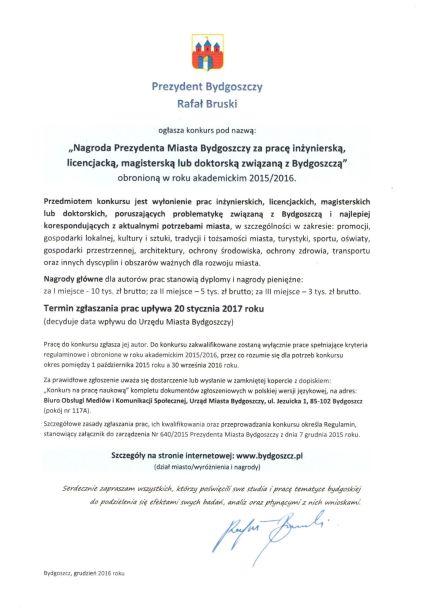 Nagroda Prezydenta Miasta Bydgoszczy za prace inżynierską, licencjacką, magisterską lub doktorską związaną z Bydgoszczą