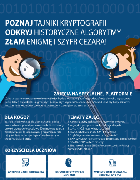 Złam szyfr ENIGMy, odkryj historyczne algorytmy kodowania danych, dowiedz się czym jest szyfr Cezara. Projekt realizowany w ramach Uniwersytetu Małego Odkrywcy finansowany przez Ministerstwo Nauki i Szkolnictwa Wyższego.