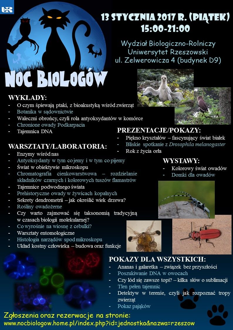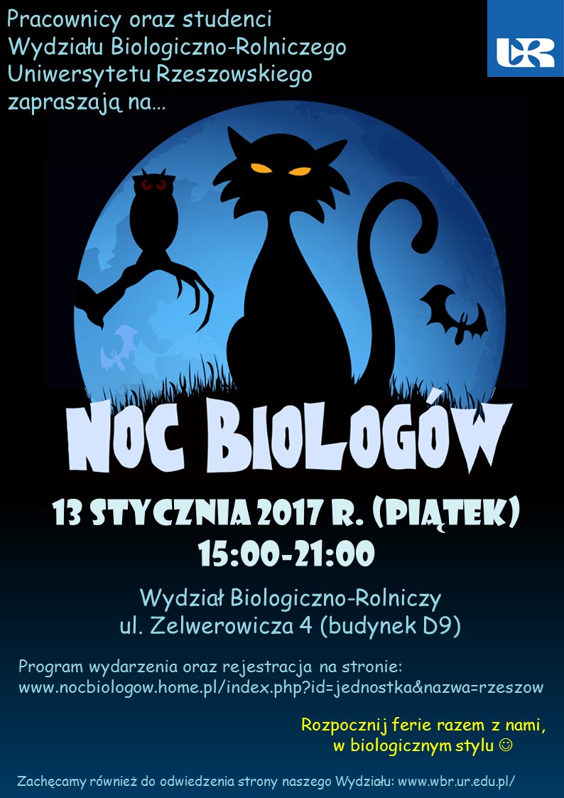 13 stycznia 2017 r. (piątek) w godz. 15:00-21:00 w budynku Wydziału Biologiczno-Rolniczego Uniwersytetu Rzeszowskiego przy ul. Zelwerowicza 4 (budynek D9) odbędzie się Pierwsza Podkarpacka Noc Biologów.