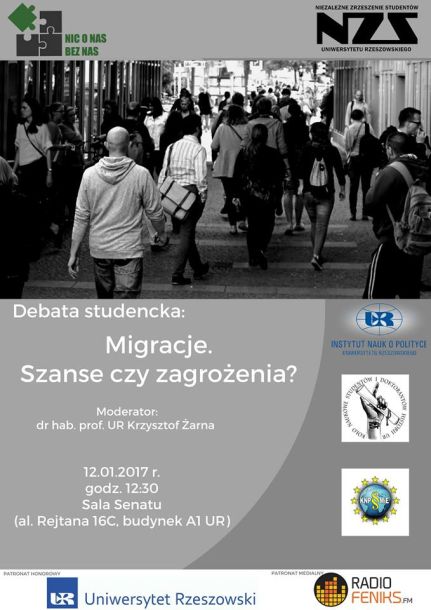 NZS Uniwersytetu Rzeszowskiego zaprasza na studencką debatę „Migracje. Szanse czy zagrożenia?”, która odbędzie się 12 stycznia 2017 r. (czwartek) o godz. 12.30 w Sali Senatu Uniwersytet Rzeszowski w B