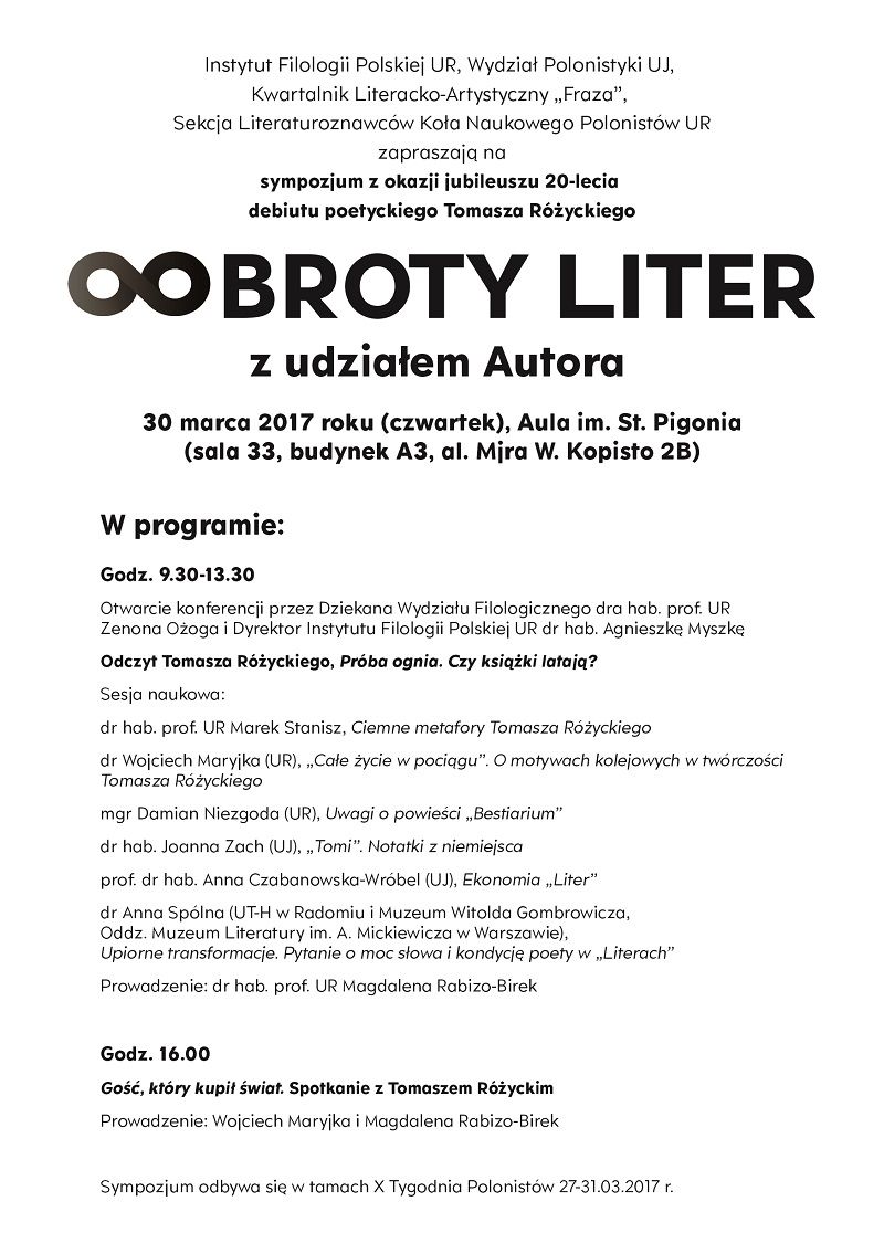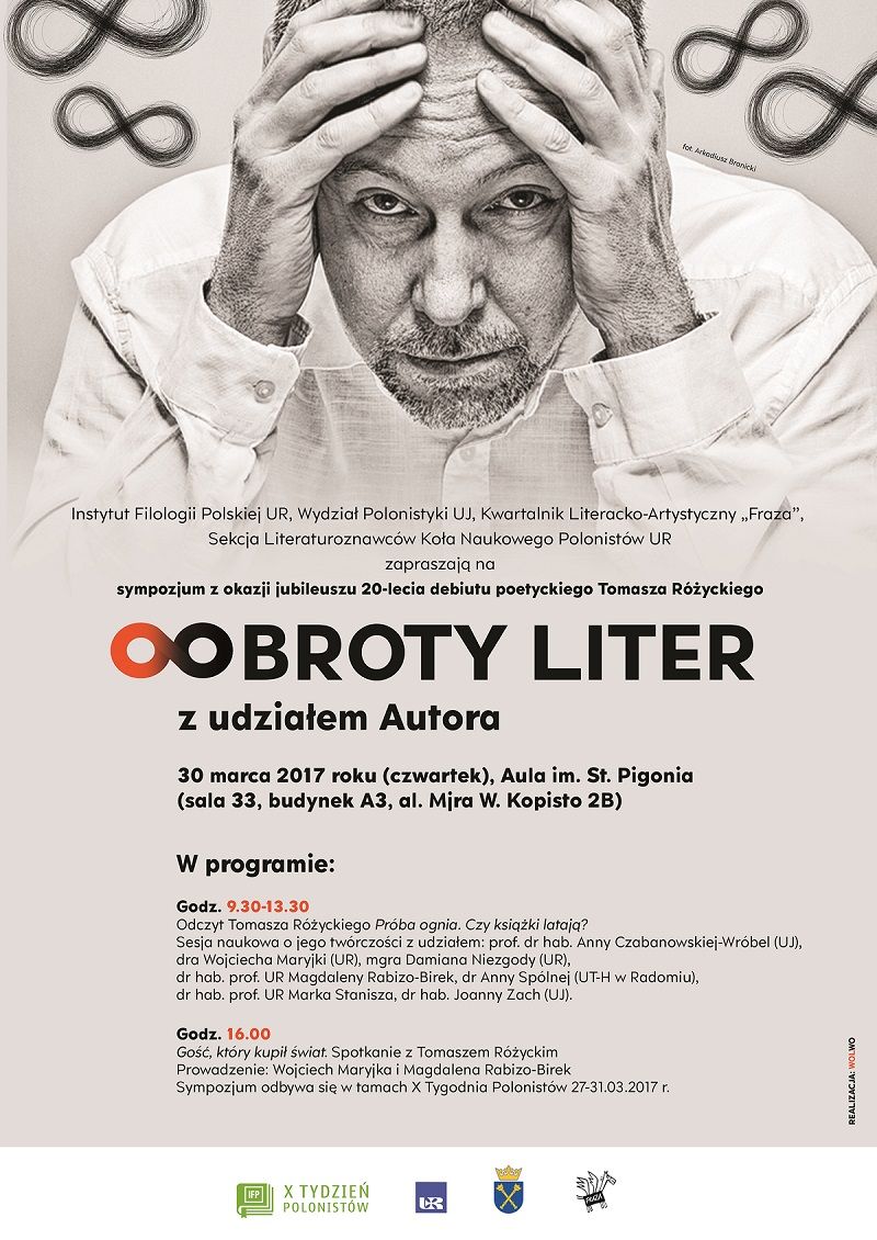 Instytut Filologii Polskiej UR, Wydział Polonistyki UJ, Kwartalnik Literacko-Artystyczny „Fraza”, Sekcja Literaturoznawców Koła Naukowego Polonistów UR zapraszają na sympozjum z okazji jubileuszu 20-lecia debiutu poetyckiego Tomasza Różyckiego Obroty liter z udziałem Autora. Wydarzenie odbędzie się 30 marca 2017 roku (czwartek) w Uniwersytecie Rzeszowskim.