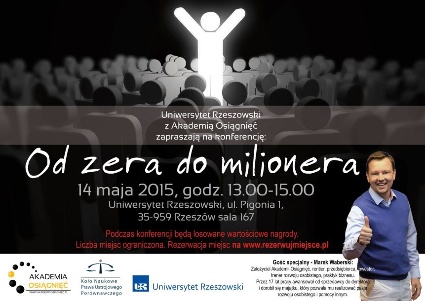 KOŁO NAUKOWE PRAWA USTROJOWEGO PORÓWNAWCZEGO działające na Wydziale Prawa i Administracji Uniwersytetu Rzeszowskiego zaprasza na konferencję "Od zera do milionera" organizowaną wraz z Akademią Osiągnięć.