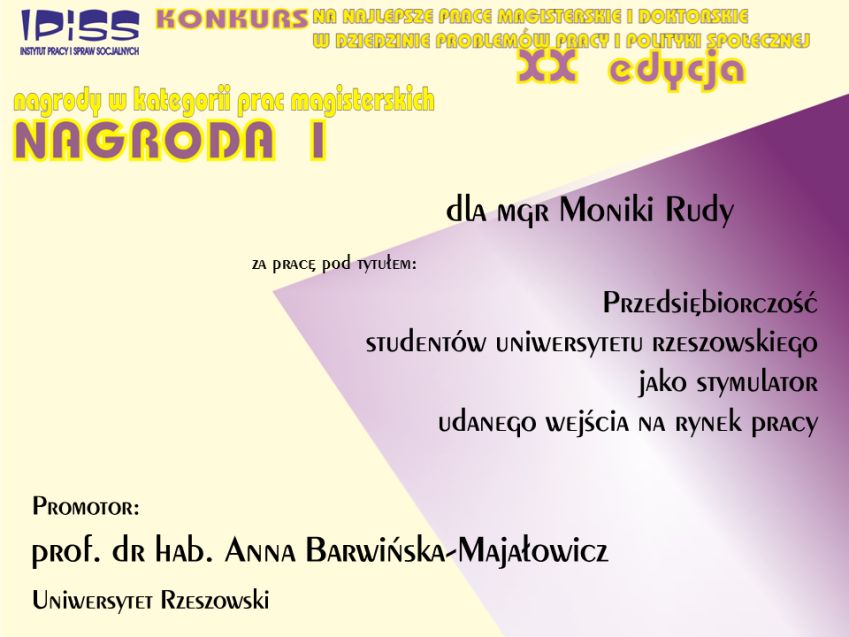 Pierwsza nagroda za pracę magisterską na Wydziale Ekonomii UR w XX edycji konkursu Instytutu Pracy i Spraw Socjalnych na najlepsze prace magisterskie i doktorskie w dziedzinie pracy i polityki społecz